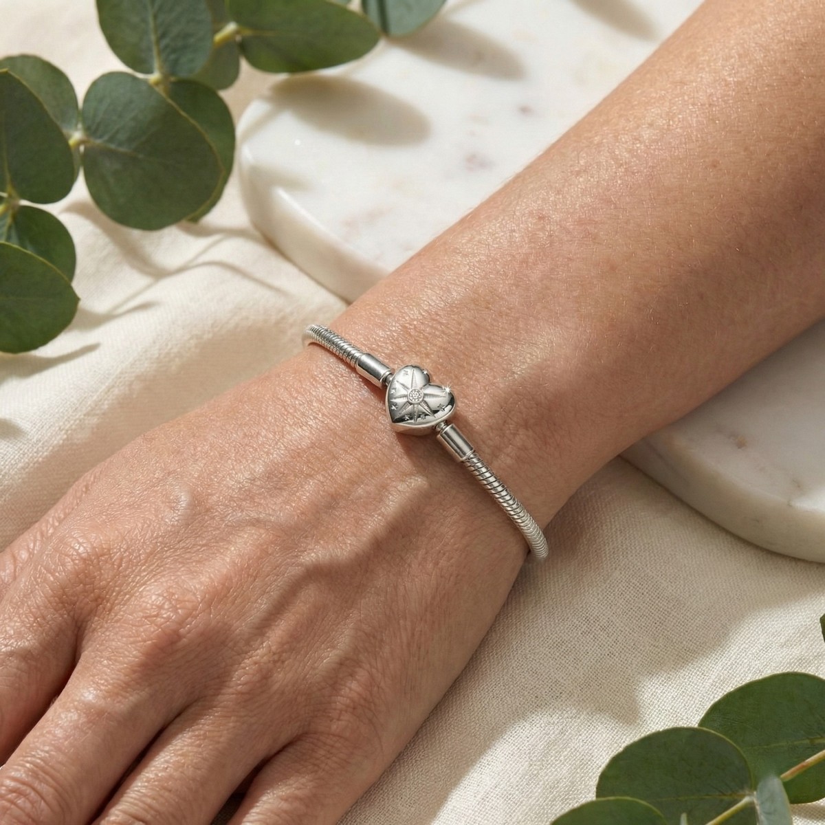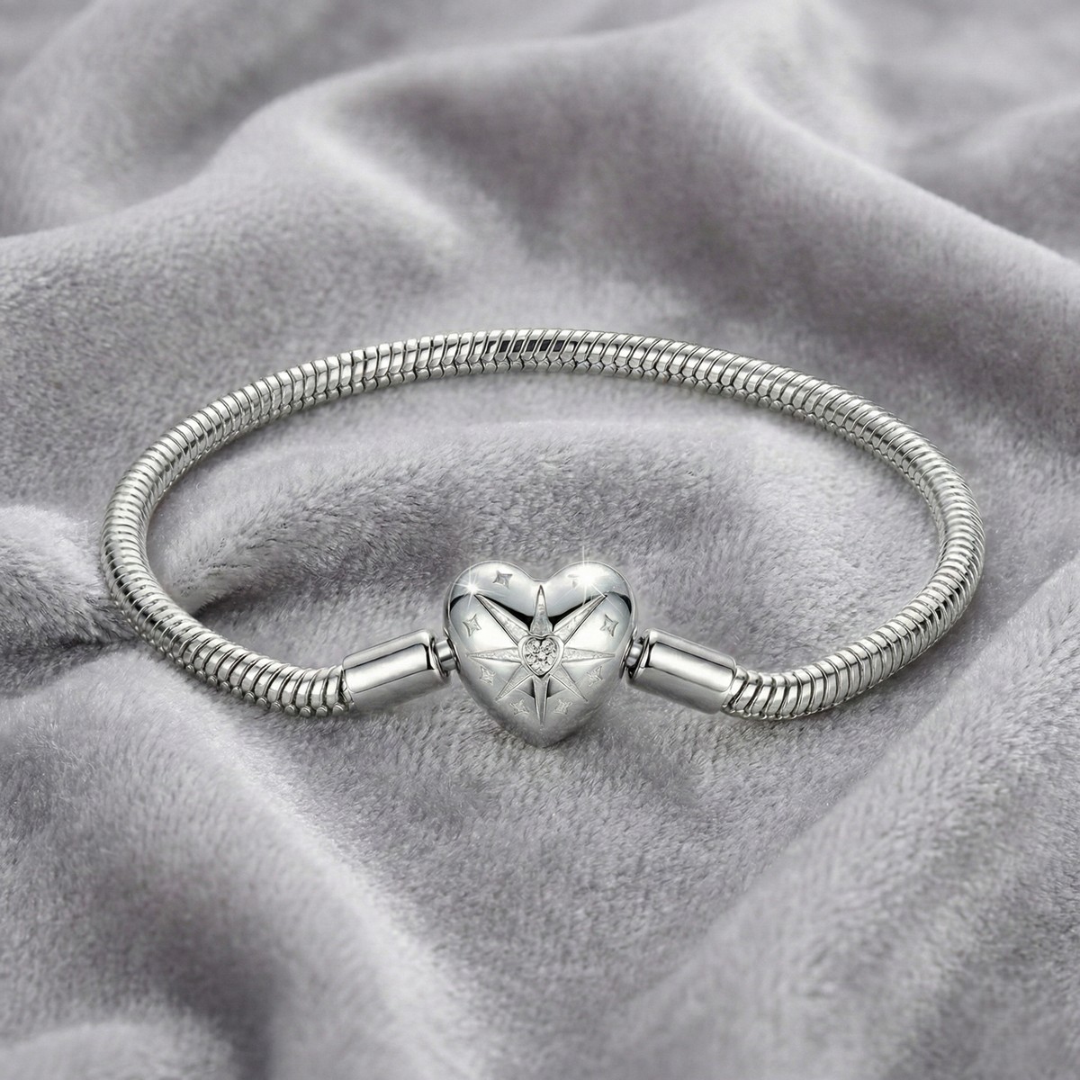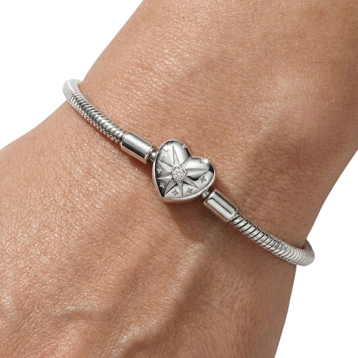 Bransoletka zachwyca minimalistycznym designem i połyskiem szlachetnych metali. Zapięcie w kształcie serca z wygrawerowaną grafiką gwiazdy dodaje jej wyjątkowego charakteru – jakby skrywała w sobie życzenie lub ważne przesłanie. Splot typu snake gwarantuje komfort noszenia i piękne dopasowanie.