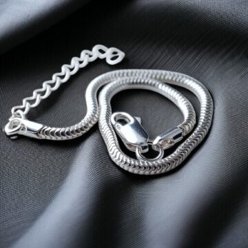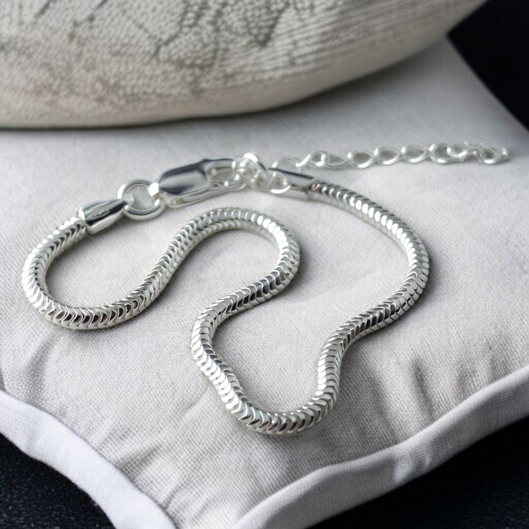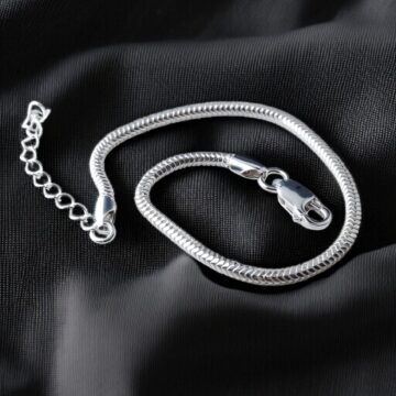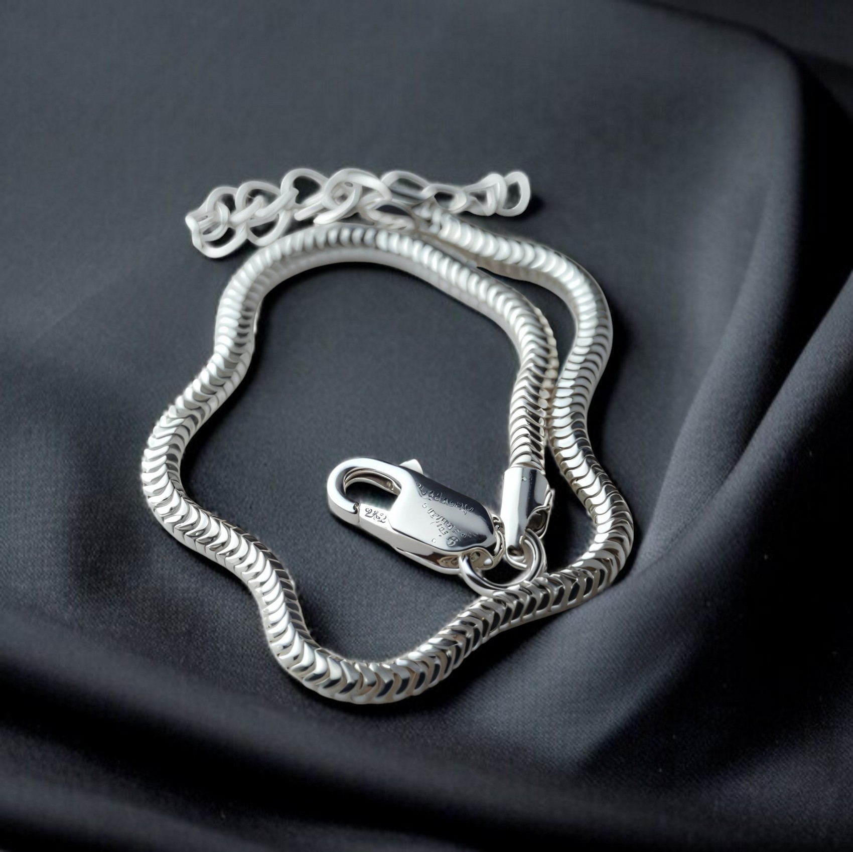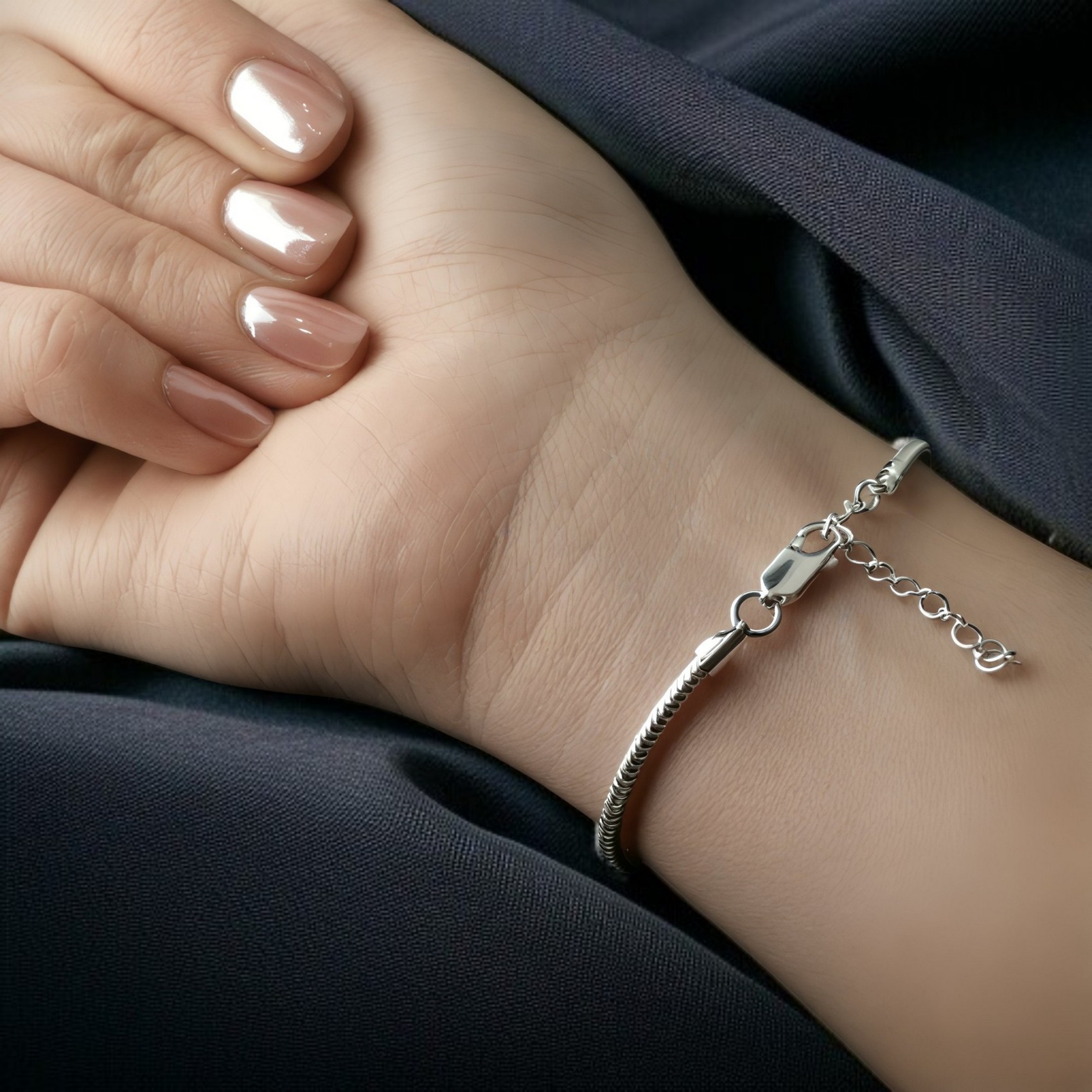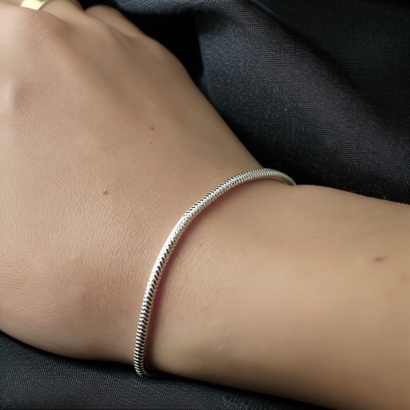 Bransoletka „Silver Flow” to uniwersalny dodatek o ponadczasowej formie. Delikatny splot pięknie układa się na skórze, odbijając światło i nadając stylizacji eleganckiego charakteru. Idealna do noszenia samodzielnie lub z ulubionymi zawieszkami.