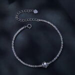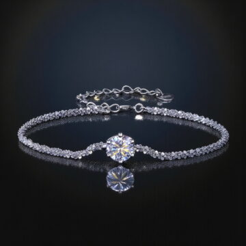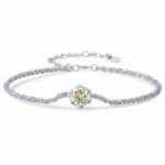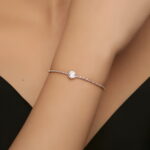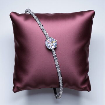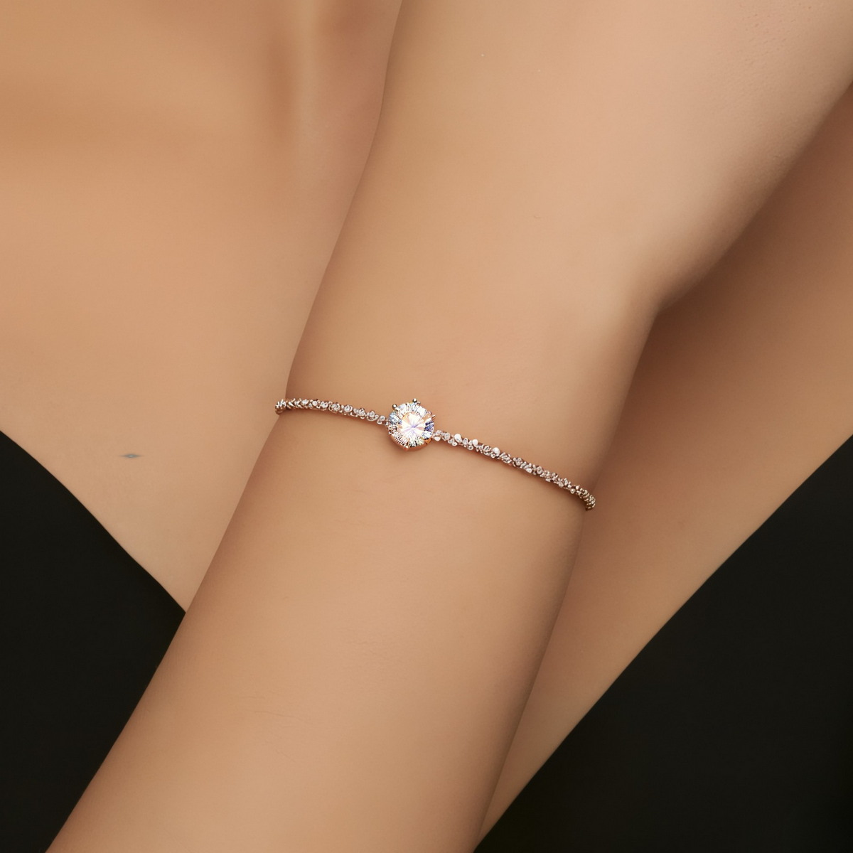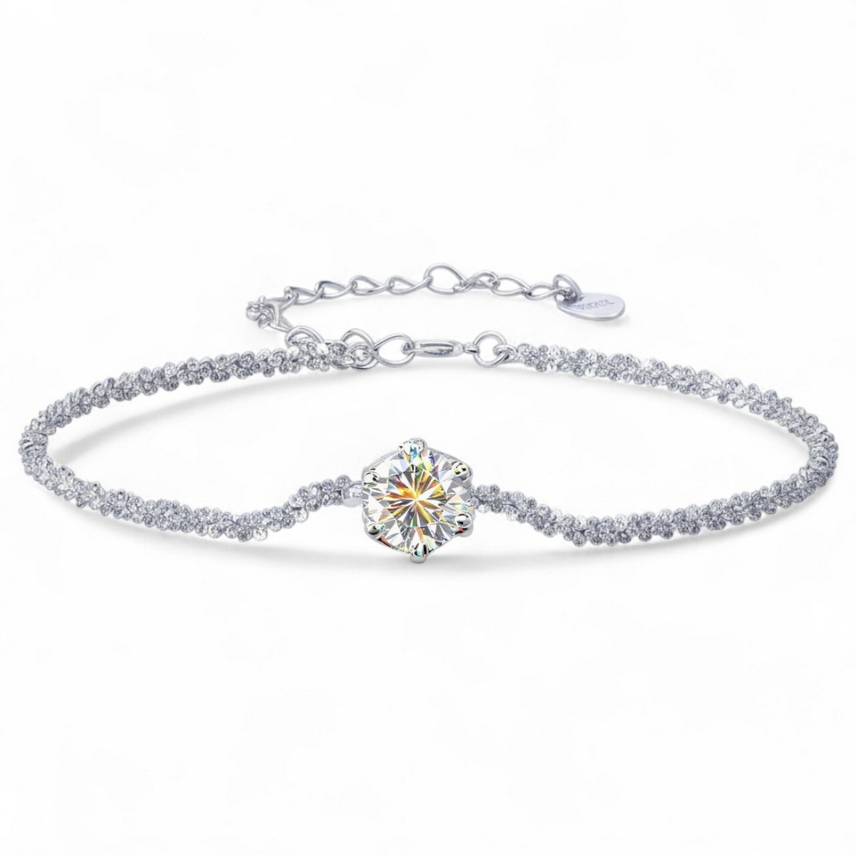 Centralny element tej bransoletki to jeden, wyrazisty kamień Moissanite, który błyszczy i olśniewa jak diament, będąc jednocześnie kamieniem bogatym w minerały i wykazującym wyższą dyspersję (ogień).