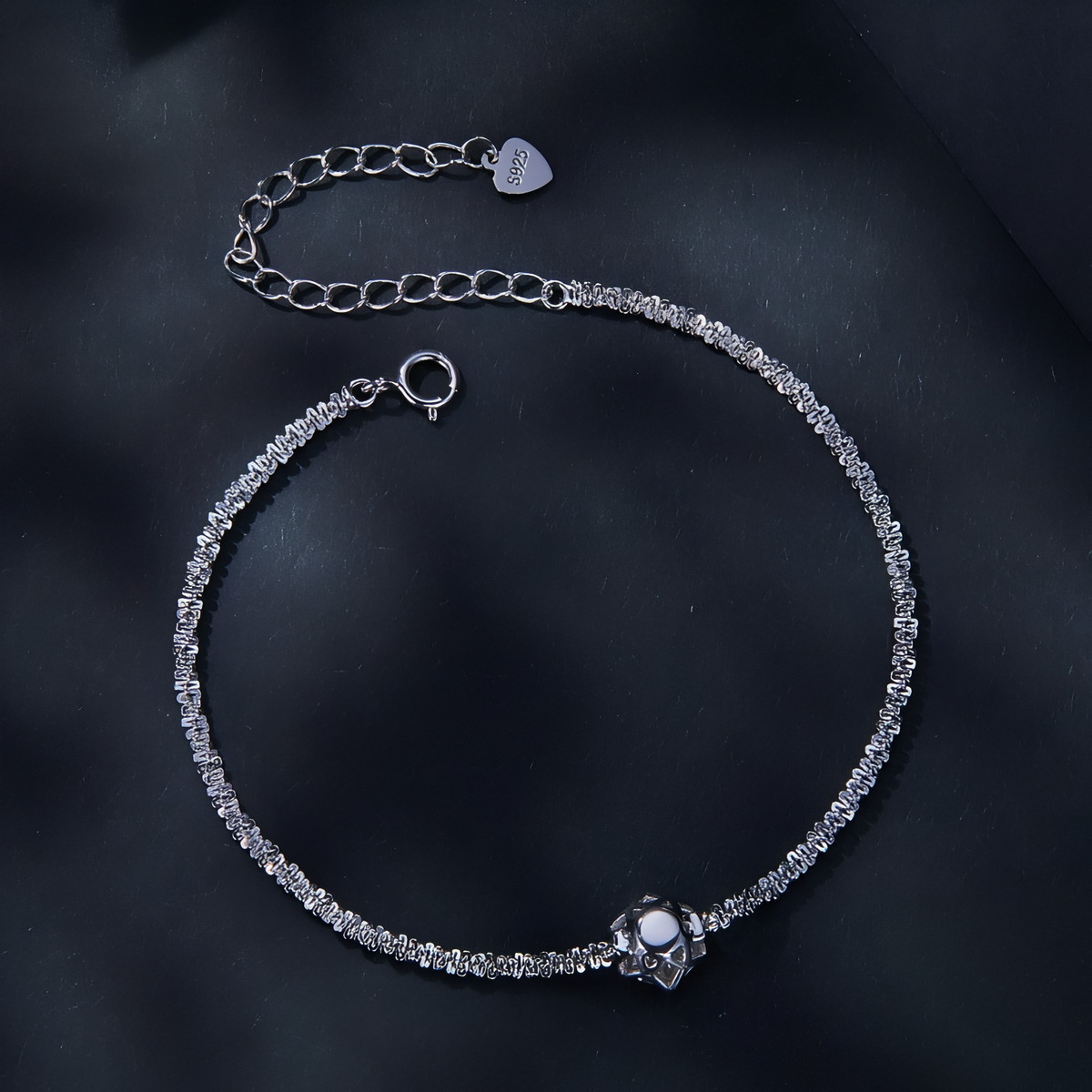 Łańcuszek “Iskrząca Pętelka”: Główna część bransoletki to unikalny łańcuszek o chropowatej, lśniącej fakturze (splot typu  Fancy Chain ze specjalnym wykończeniem), który łapie światło, dając efekt ciągłego blasku. Część łańcuszka okalająca kamień jest ozdobiona rzędem mniejszych akcentów.