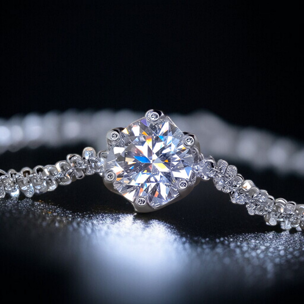 Centralny Akcent: Moissanite osadzony jest w delikatnej, sześciopazurkowej oprawie, która przypomina stylizowany kwiat lub gwiazdę, maksymalnie eksponując kamień i wpuszczając światło.