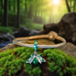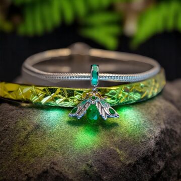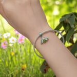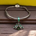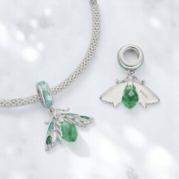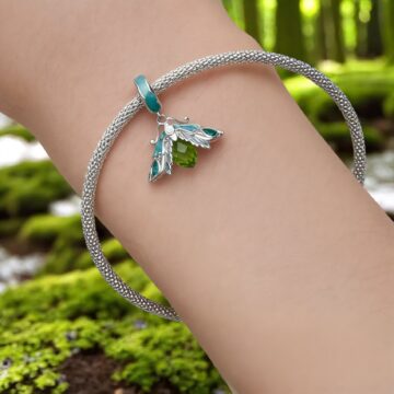 Zawieszka olśniewa subtelnym połączeniem zieleni, srebra i lśniącej emalii. Fasetowany kryształ w kształcie kropli pięknie odbija światło, a misterne skrzydełka i korpus tworzą iluzję ruchu. Tylna strona charmsa również zachwyca – wykończona gładko, z wybitą próbą „S925”.