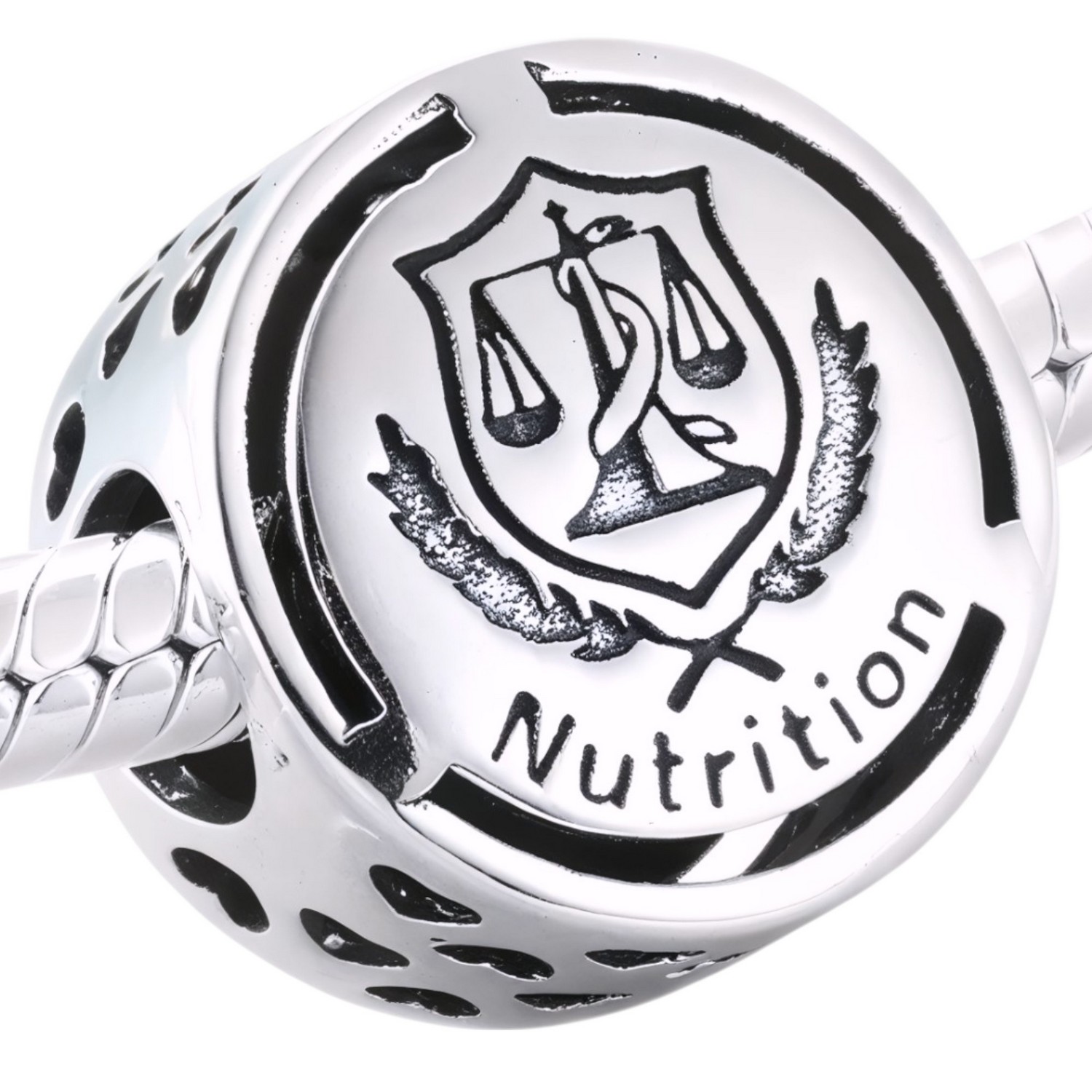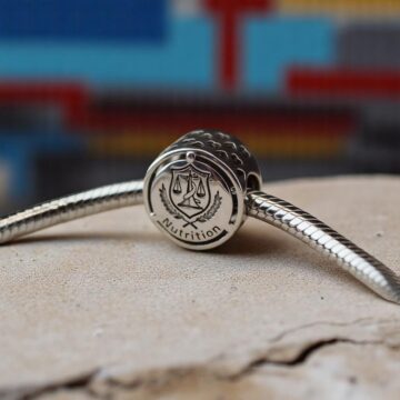 Ten charms przedstawia logo dietetyka, które stało się symbolem zdrowego stylu życia, świadomego odżywiania i dbałości o równowagę w życiu. “Nutrition” to zawód, który wspiera zdrowie, a jego symbolika wpisuje się w filozofię dbania o siebie poprzez odpowiednią dietę i wybory żywieniowe.
