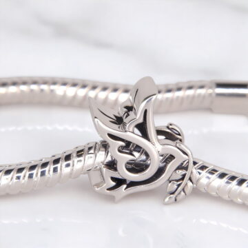 Charms “Duch Święty” to piękna i pełna symboliki ozdoba, wykonana z najwyższej jakości srebra próby 925. Jego delikatny, ażurowy design przedstawia gołębicę – uniwersalny symbol Ducha Świętego, pokoju i nadziei. Gołębica trzyma w dziobie subtelną gałązkę oliwną, co dodatkowo wzmacnia przesłanie harmonii i odnowy.