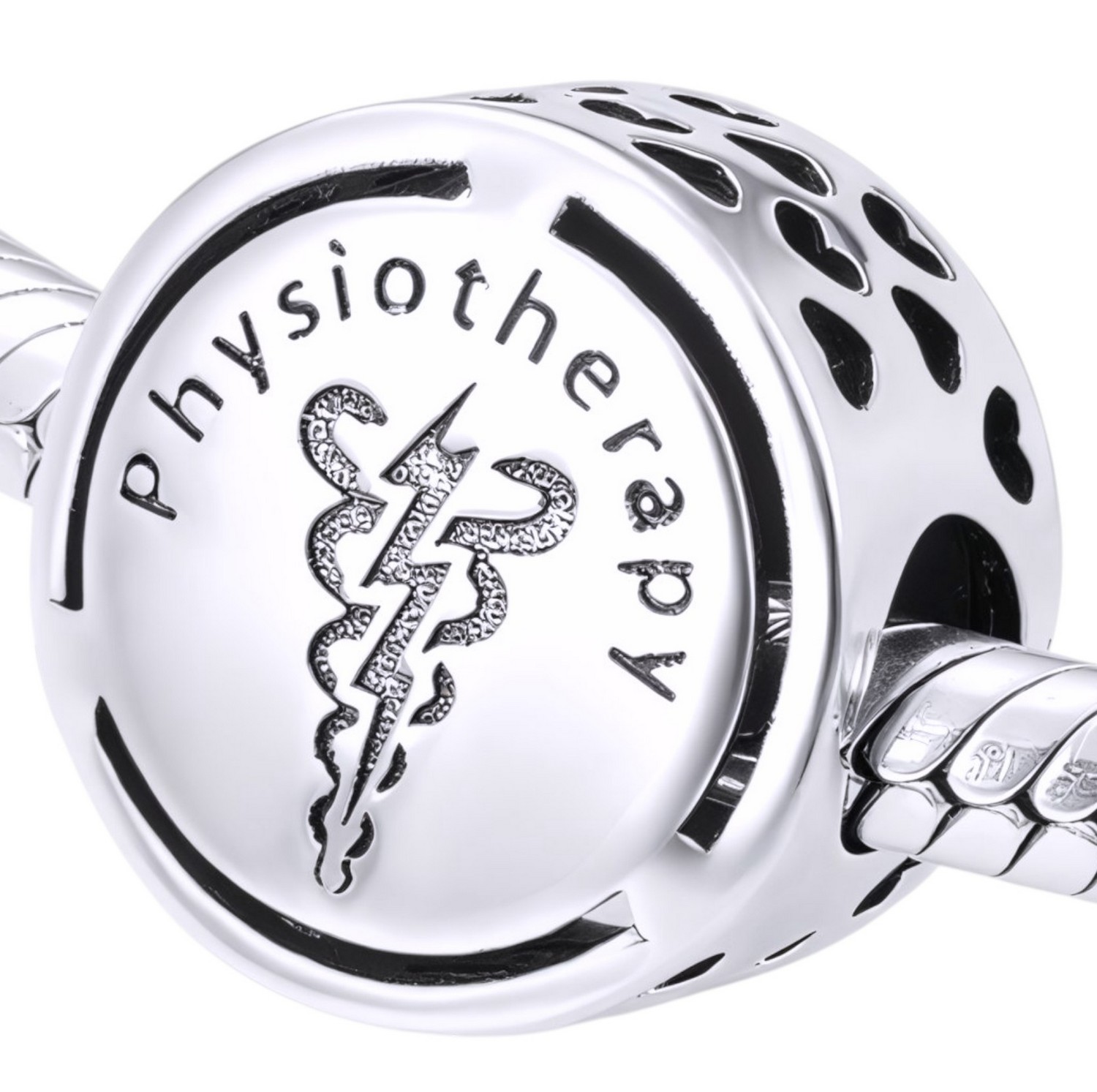 Ten charms to hołd dla fizjoterapeutów, którzy na co dzień dbają o nasze zdrowie i dobre samopoczucie. Z wyraźnym napisem „physiotherapy” oraz symbolem kija Eskulapa, przedstawiającym wężem owijającym drzewce, charms przypomina o terapii i rehabilitacji, niosącym ulgę w bólu oraz wspierającym powrót do pełnej sprawności. Jest to doskonały wybór dla każdego, kto szanuje zawód fizjoterapeuty.