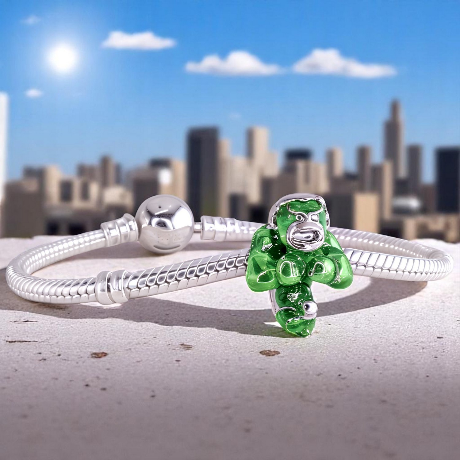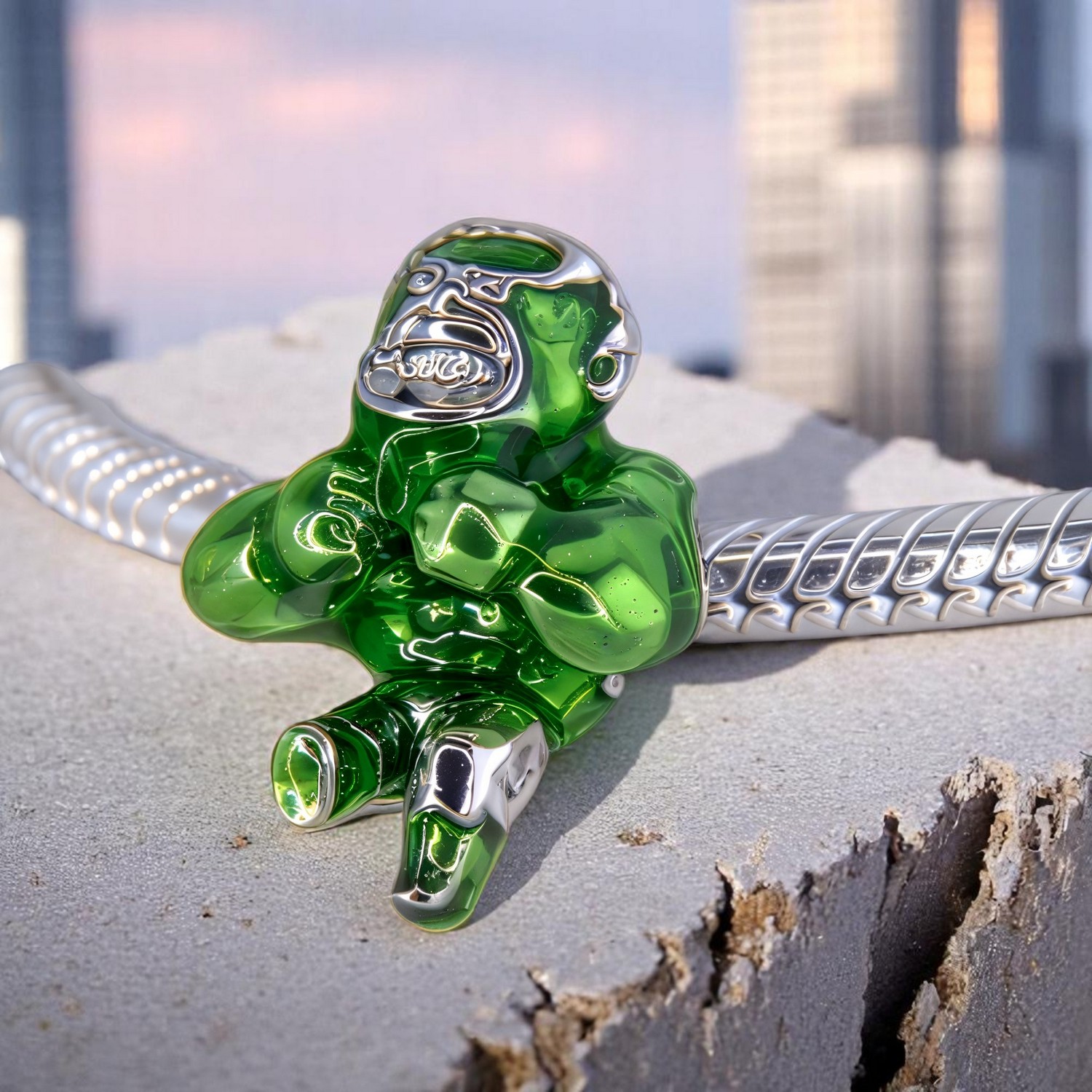 Charms Hulk to hołd dla potężnej postaci z uniwersum Marvela, będącego symbolem niepowstrzymanej siły i odwagi. Jego intensywny zielony kolor odzwierciedla nie tylko jego charakterystyczną barwę, ale również niesamowitą moc, która nigdy nie daje się powstrzymać.