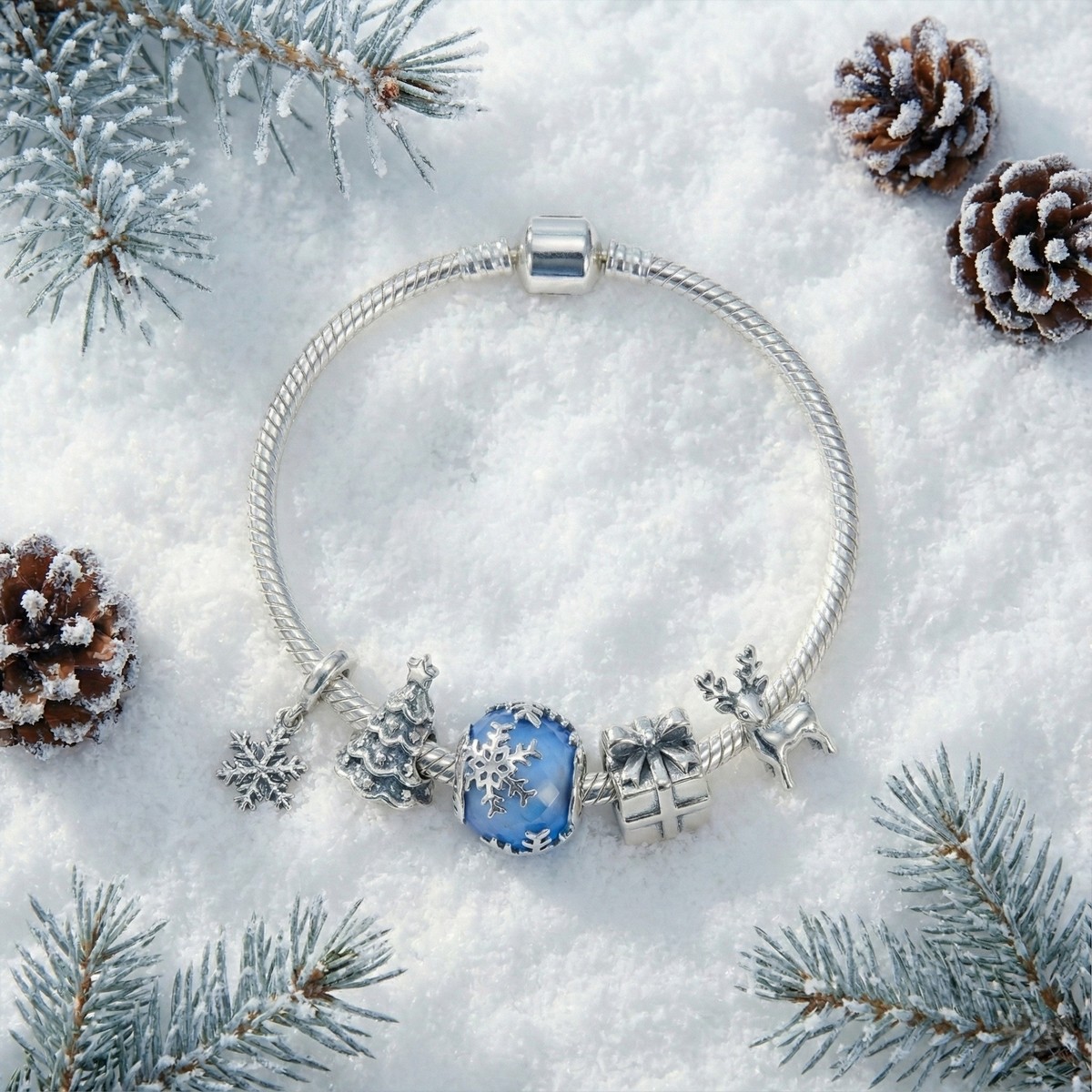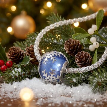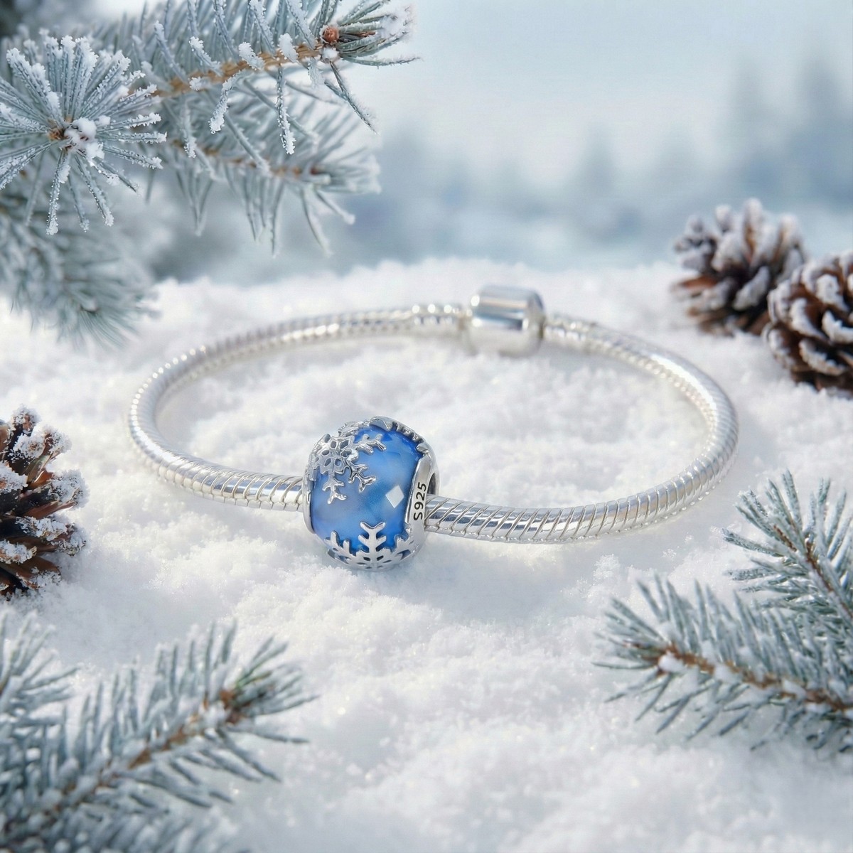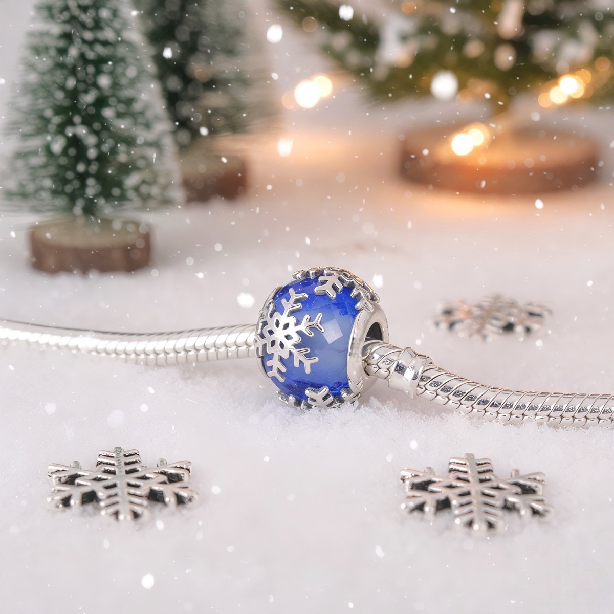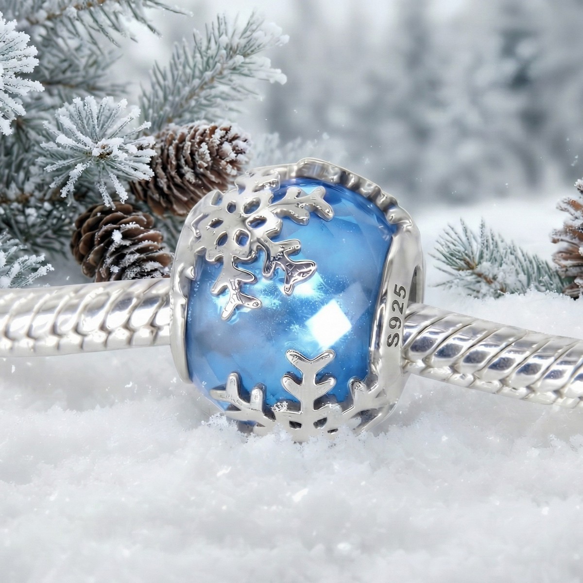 Ten charms to esencja zimowego krajobrazu. Łączy w sobie hipnotyzujący, niebieski koralik ze szkła z delikatną, srebrną oprawą. Centralny, fasetowany koralik, mieniący się jak tafla lodu, otoczony jest misternym wzorem śnieżynek, co tworzy wyjątkowo elegancki i zimowy akcent na Twojej bransoletce.