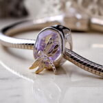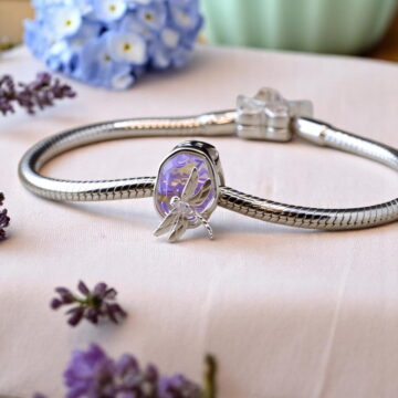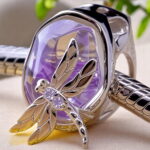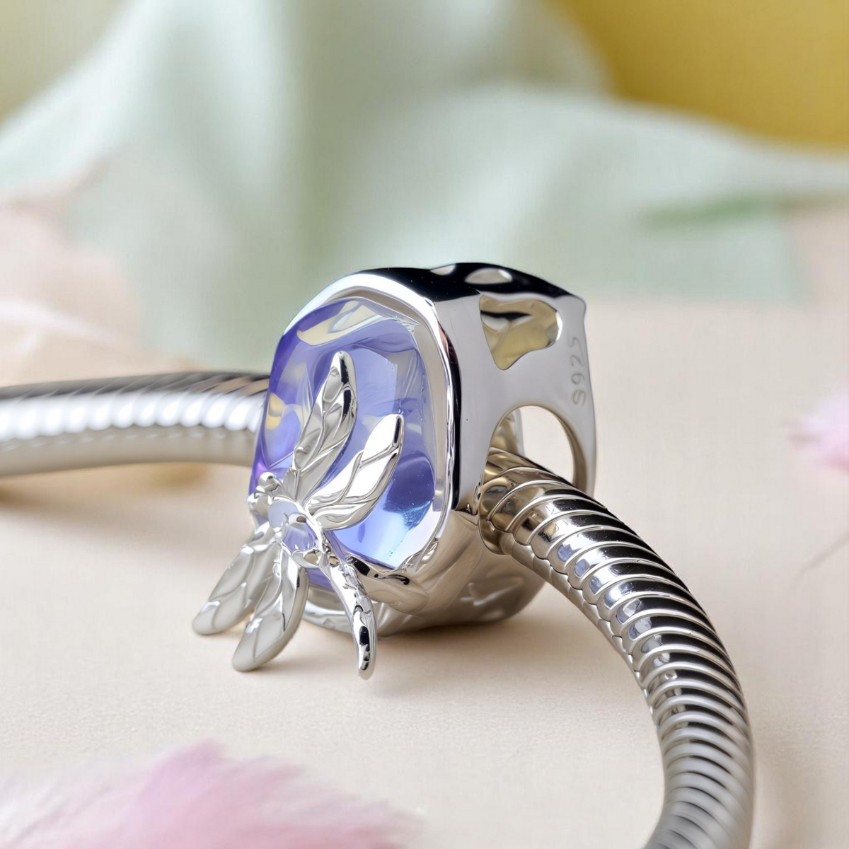 Charms “Lśniąca Ważka Moneta” to unikatowa ozdoba wykonana ze srebra 925 pokrytego białym złotem, inspirowana impresjonistycznymi obrazami słynnego malarza Claude’a Moneta. Centralnym elementem jest elegancka ważka o precyzyjnie wykonanych skrzydłach, której tułów zdobią delikatne opalizujące kamienie. Całość umieszczona jest na transparentnym lawendowym szkle, które przywołuje magiczną atmosferę stawu z liliami wodnymi, tworząc efekt trójwymiarowej głębi i gry światła.