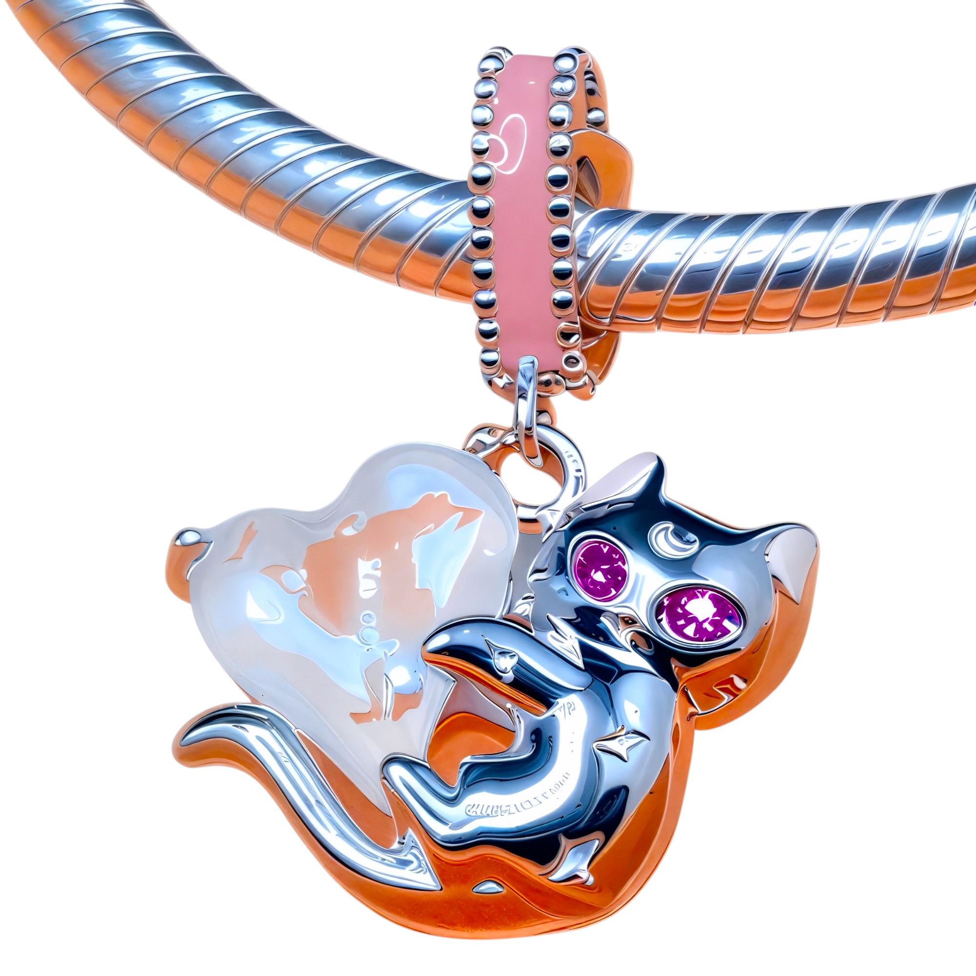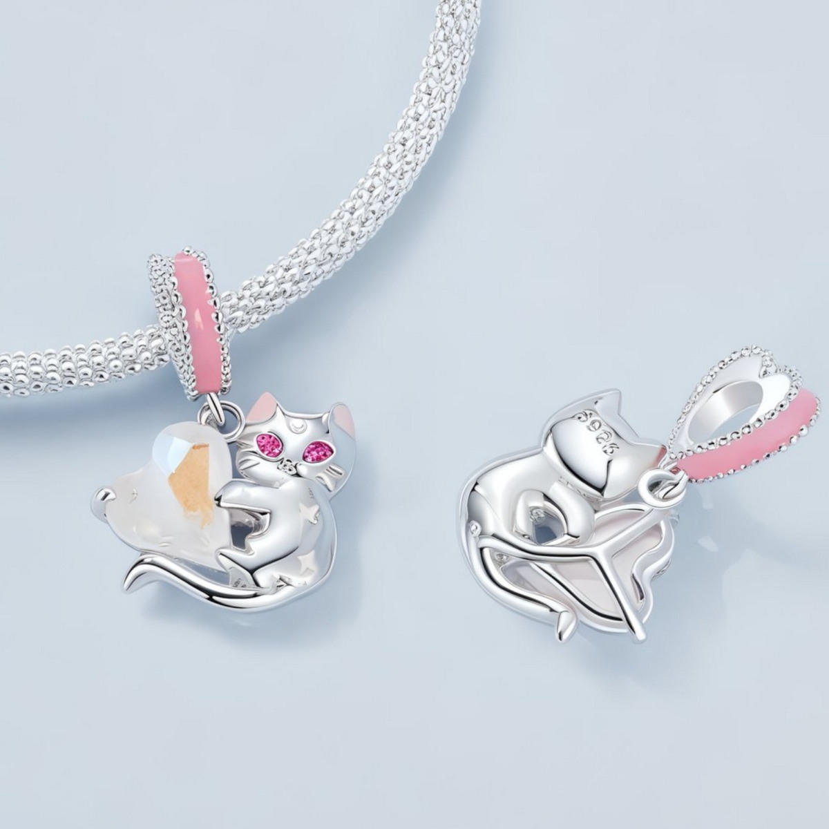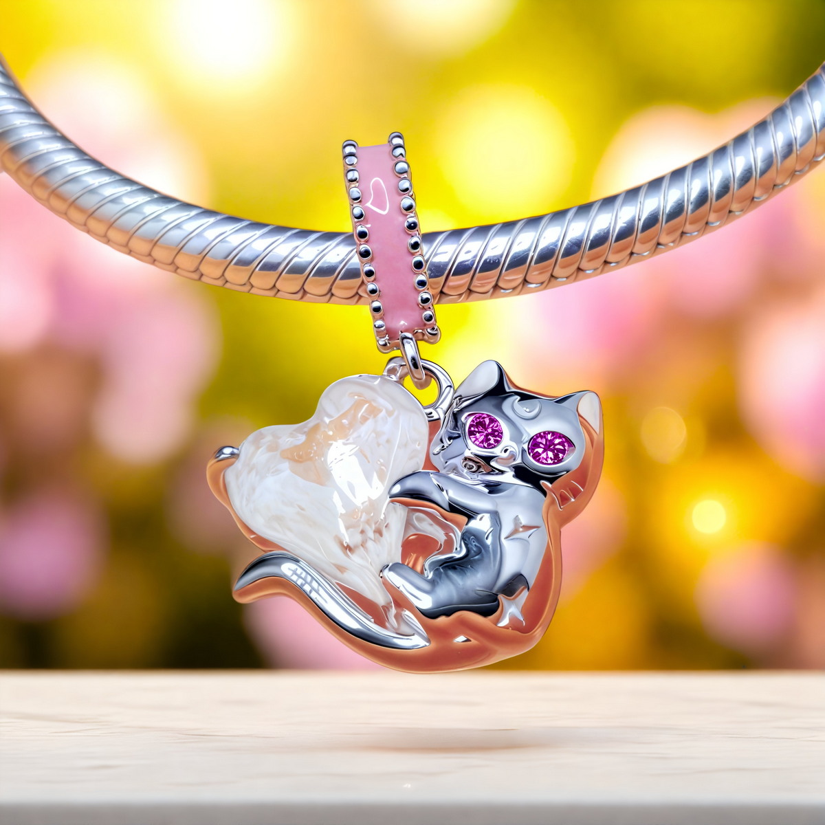 Charms “Magiczny Kotek” to wyjątkowa ozdoba wykonana ze srebra 925 pokrytego platyną, która zachwyca swoim uroczym, bajkowym designem. Centralnym elementem jest srebrny kotek obejmujący mieniący się kryształ w kształcie serca, który mieni się hipnotyzującymi odcieniami różu i pomarańczu. Różowa emalia na uszach i gwiazdkach na ciele kotka dodaje uroczego charakteru, a błyszczące różowe cyrkonie tworzące oczy nadają mu magicznego, roziskrzonego spojrzenia.