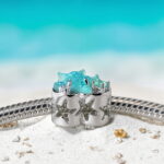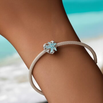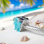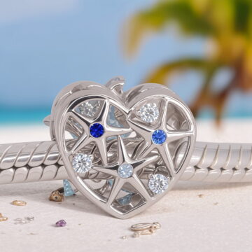 Charms “Morska Rozgwiazda” to wyjątkowa ozdoba wykonana ze srebra 925 platerowanego białym złotem, która przeniesie Cię prosto na egzotyczną plażę. Centralnym elementem jest przepiękna błękitna rozgwiazda wykonana z żywicy o fascynującej, bąbelkowej strukturze, która doskonale imituje fakturę prawdziwej rozgwiazdy. Umieszczona jest na ażurowym, srebrnym sercu wysadzanym błyszczącymi cyrkoniami w odcieniach bieli i błękitu oraz opalizującym kamieniem przypominającym morską głębię.