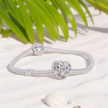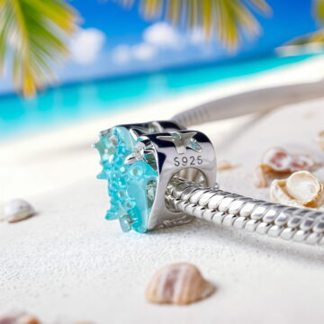 Charms “Morska Rozgwiazda” to wyjątkowa ozdoba wykonana ze srebra 925 platerowanego białym złotem, która przeniesie Cię prosto na egzotyczną plażę. Centralnym elementem jest przepiękna błękitna rozgwiazda wykonana z żywicy o fascynującej, bąbelkowej strukturze, która doskonale imituje fakturę prawdziwej rozgwiazdy. Umieszczona jest na ażurowym, srebrnym sercu wysadzanym błyszczącymi cyrkoniami w odcieniach bieli i błękitu oraz opalizującym kamieniem przypominającym morską głębię.