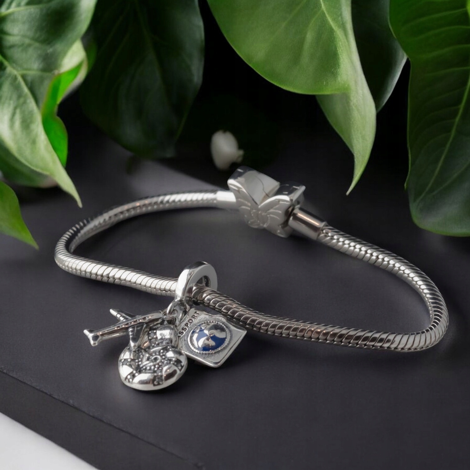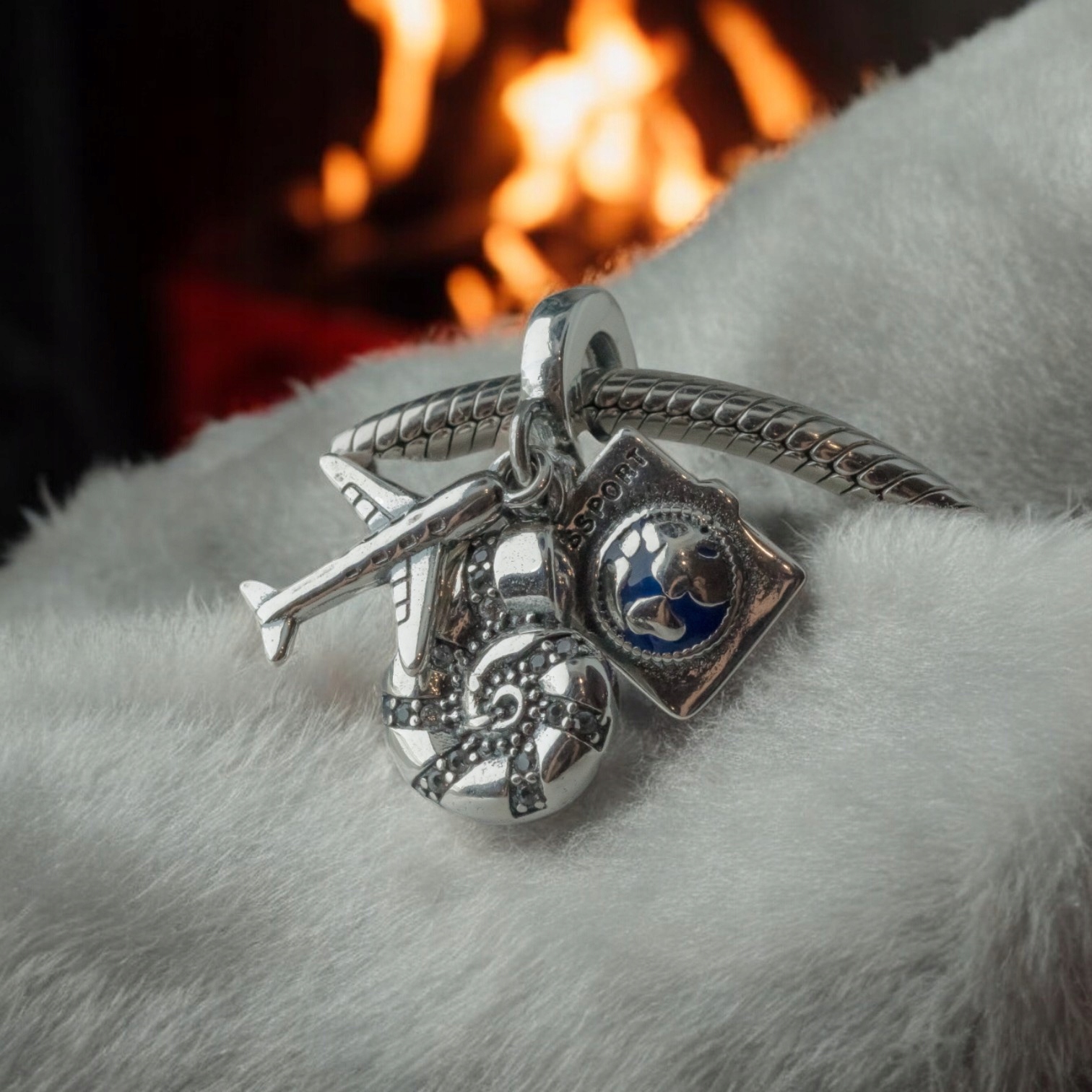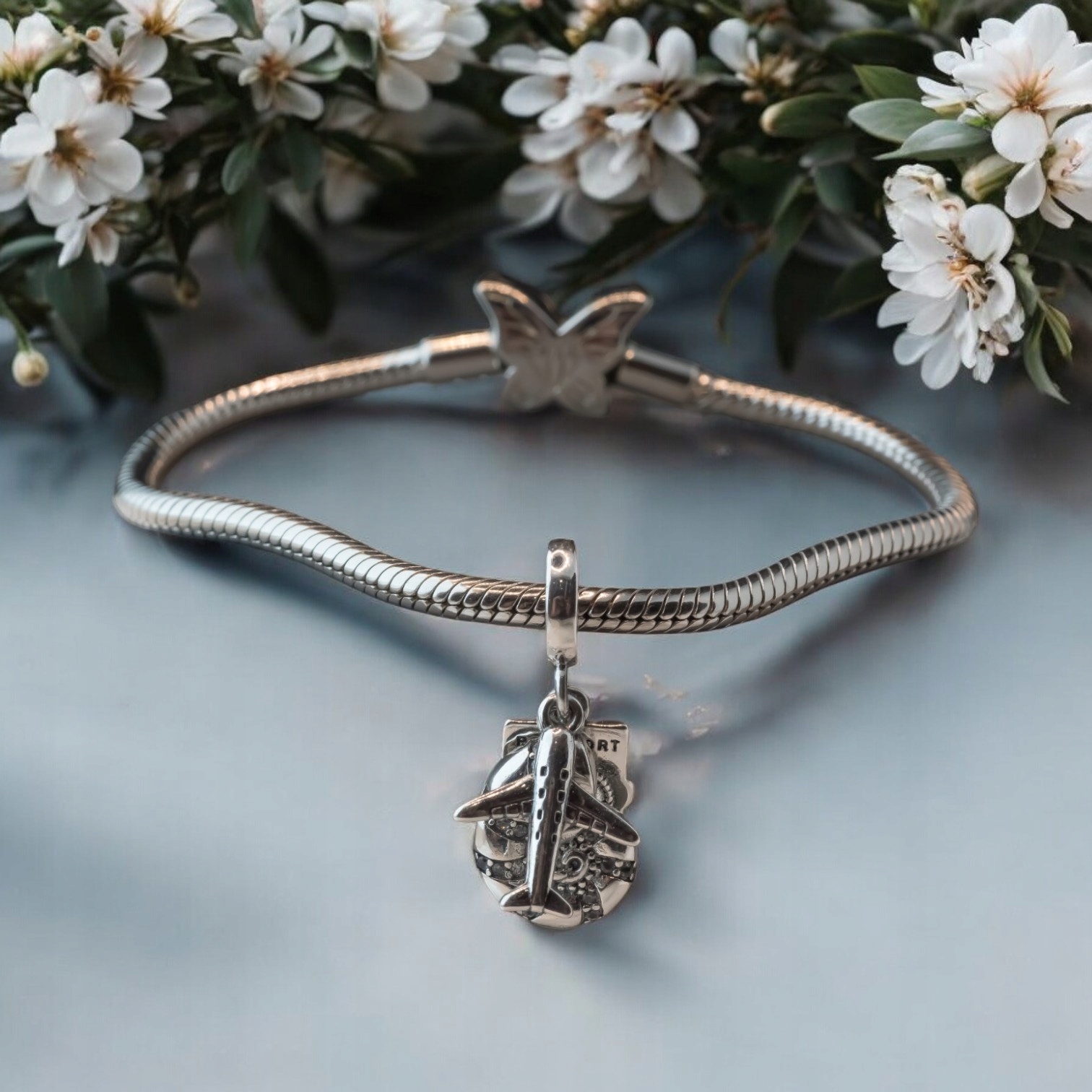 Charms z trzema zawieszkami – paszportem, samolotem i muszlą – to wyjątkowa ozdoba, która symbolizuje podróże, odkrywanie świata i przygodę.