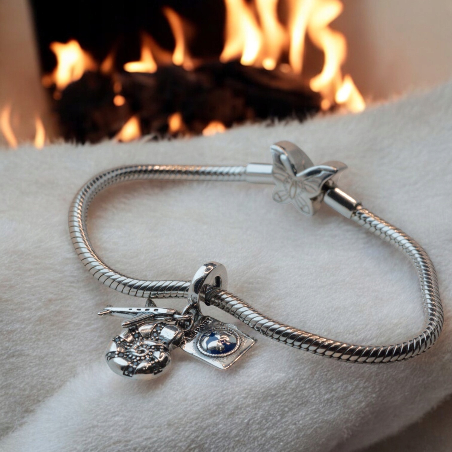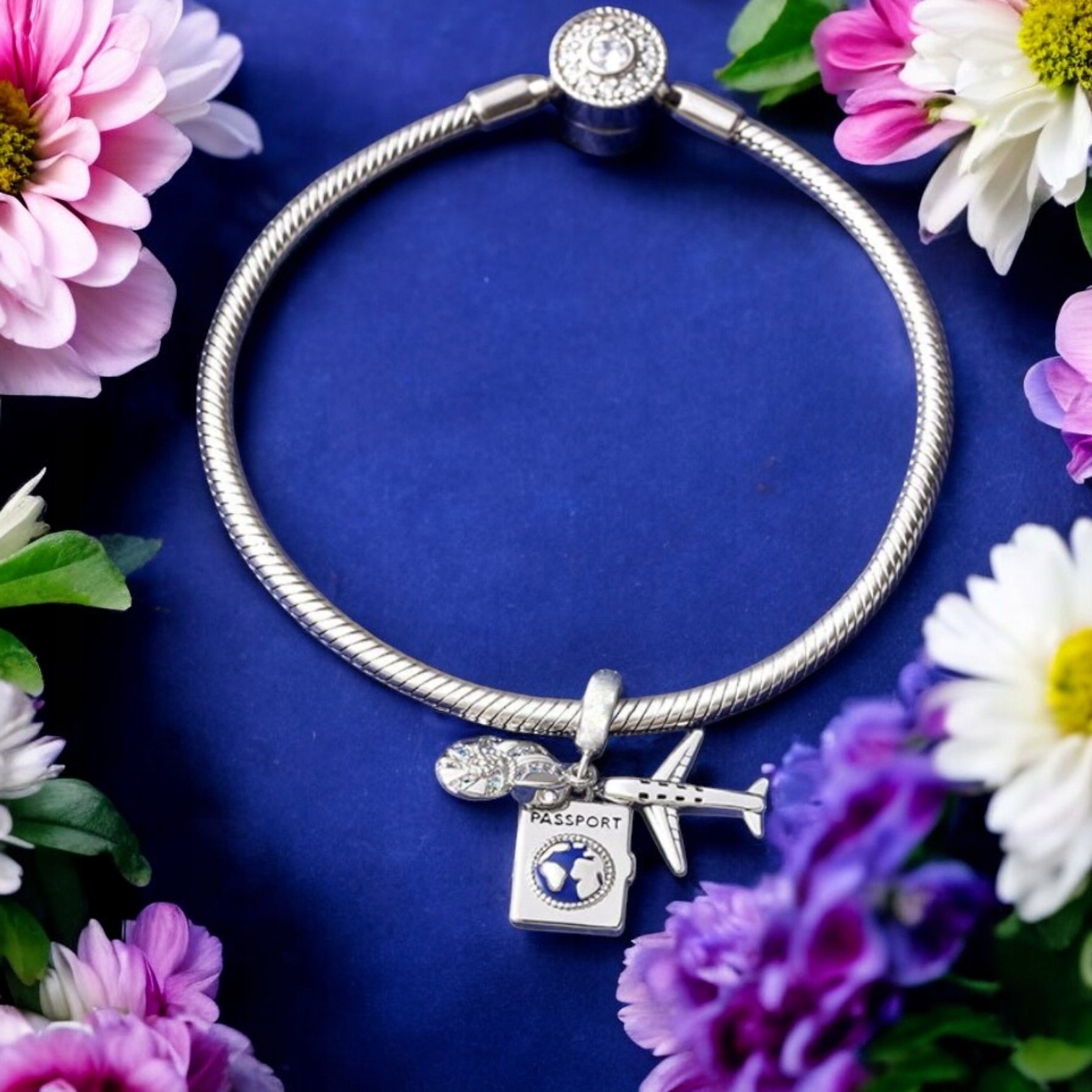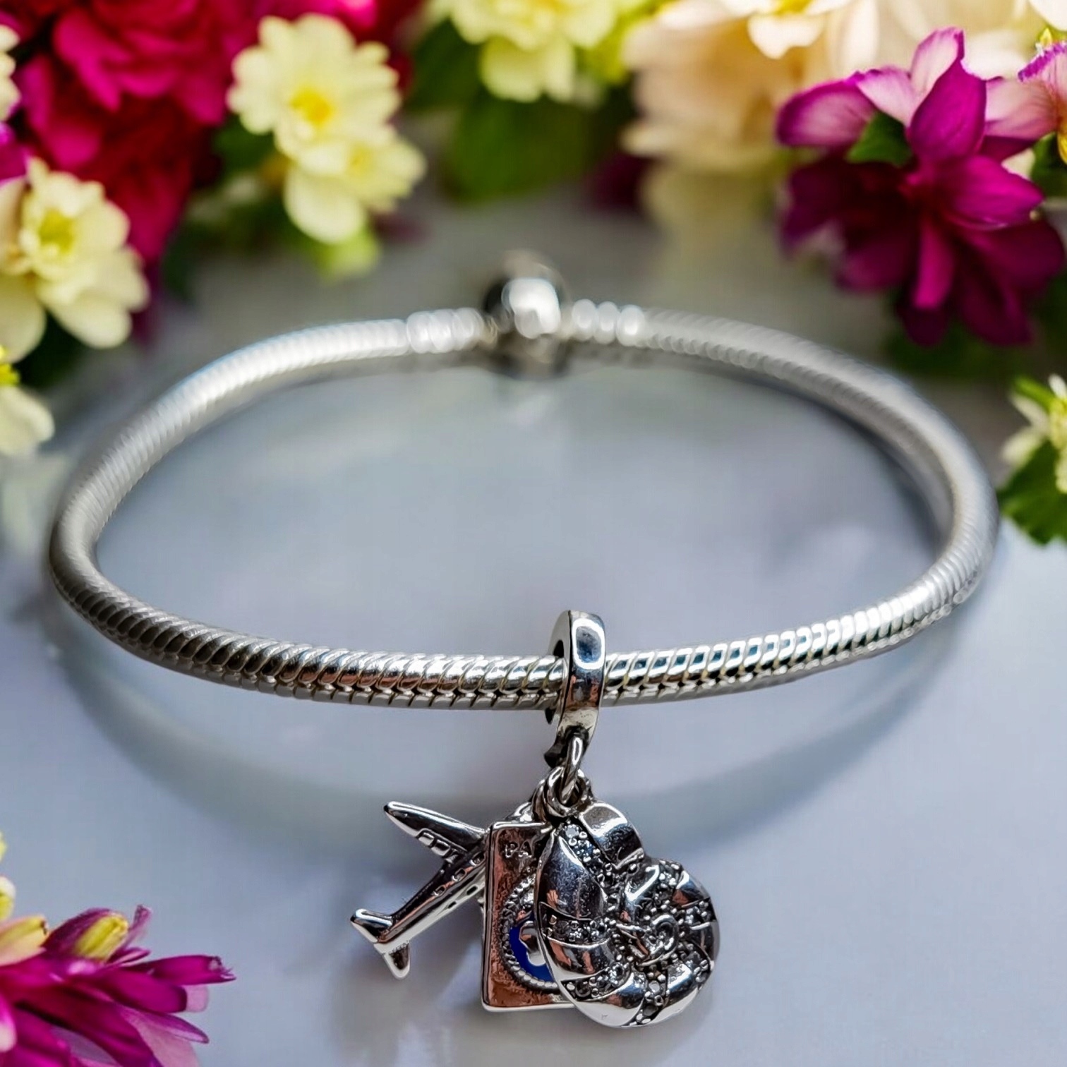Charms z trzema zawieszkami – paszportem, samolotem i muszlą – to wyjątkowa ozdoba, która symbolizuje podróże, odkrywanie świata i przygodę.