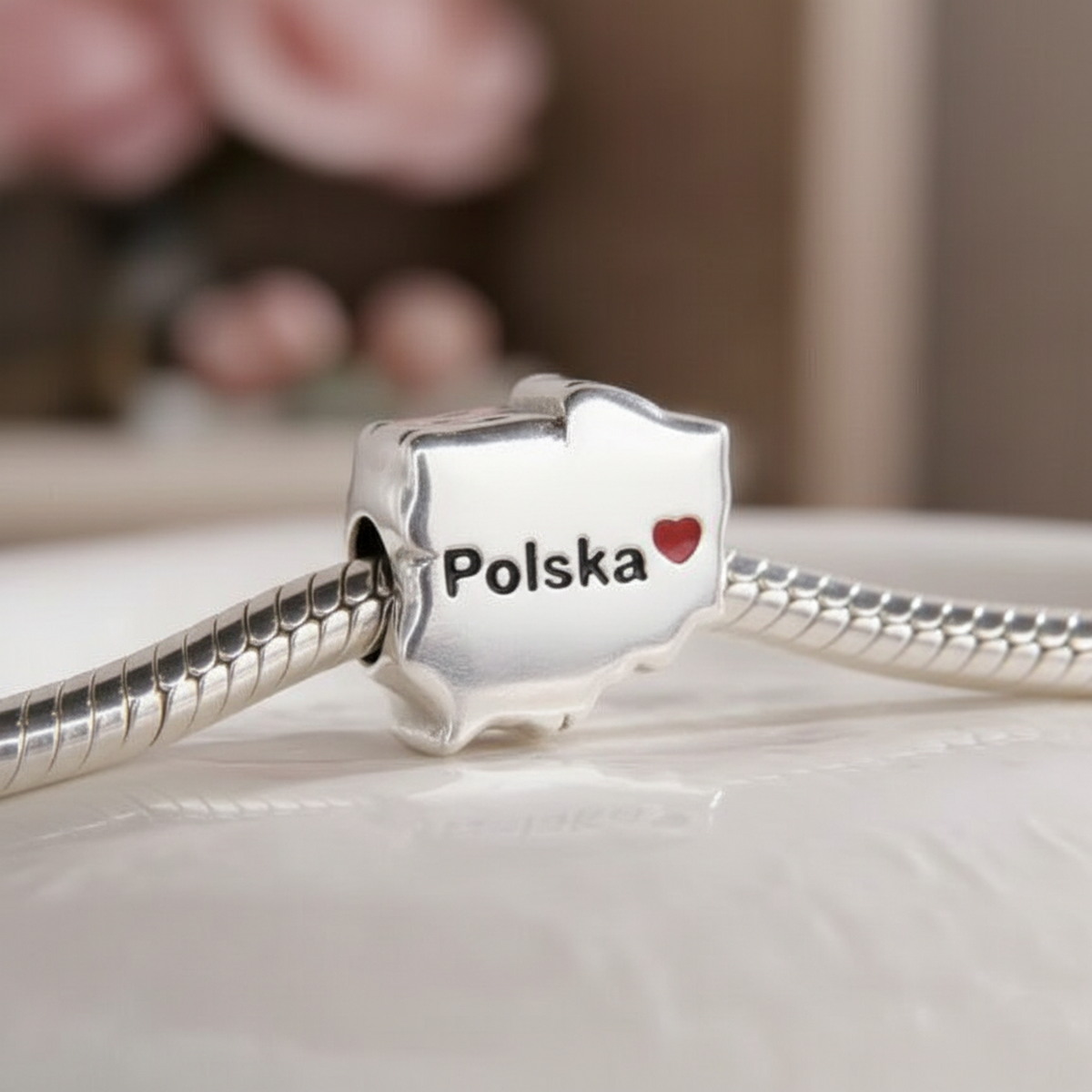💖 Grawer “Polska z Serduszkiem” – na odwrocie charmsa umieszczono wzruszający grawer “Polska” z urokliwym serduszkiem, co stanowi piękny wyraz miłości do kraju.