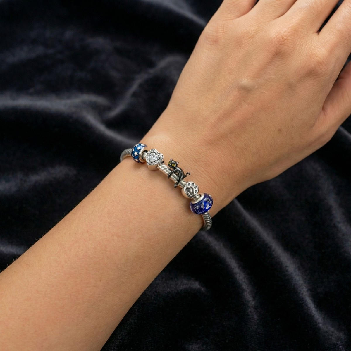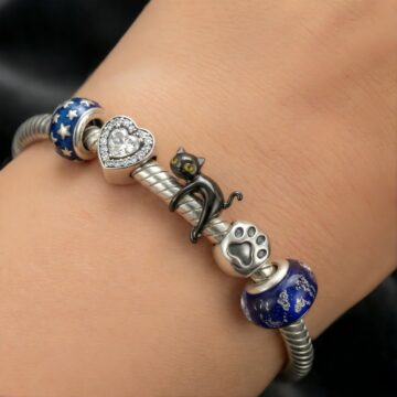 📏 Uniwersalność: Dzięki otworowi o średnicy 4.5 mm, kotek pasuje na większość popularnych bransoletek modułowych (typu żmijka), takich jak Pandora, Apart czy YES.