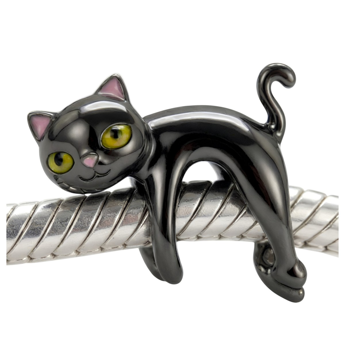 Ten charms to prawdziwa perełka dla miłośniczek kotów. Wyróżnia się nietypową konstrukcją – kotek nie wisi tradycyjnie pod bransoletką, lecz leży na niej, oplatając ją łapkami i ogonem. Wygląda to tak, jakby Twój mały przyjaciel leniwie odpoczywał na Twoim nadgarstku, co daje niesamowicie realistyczny i zabawny efekt 3D.