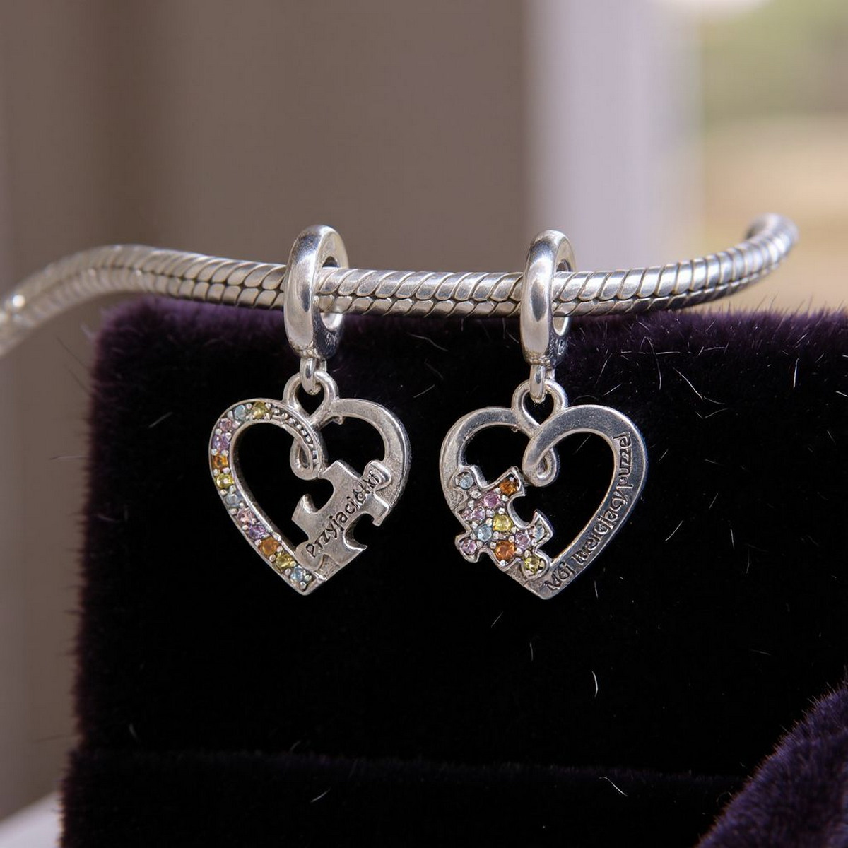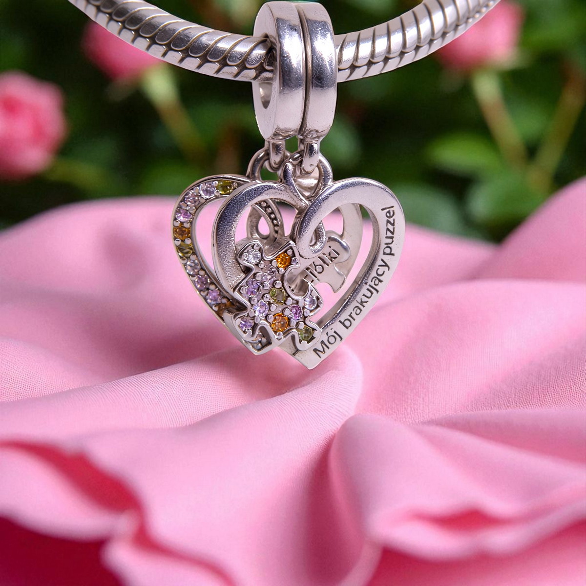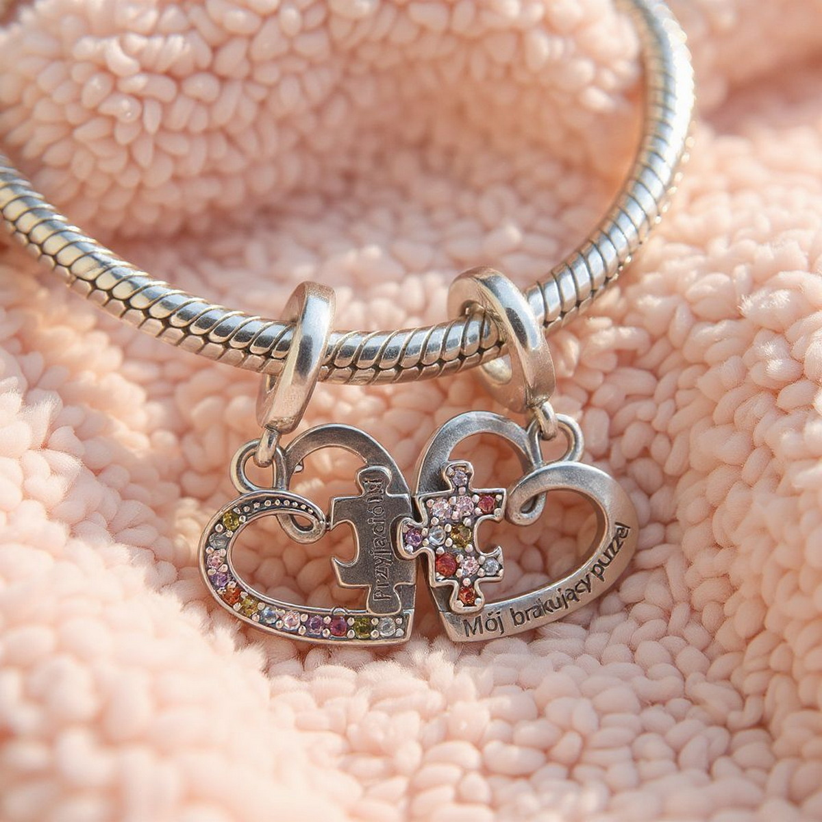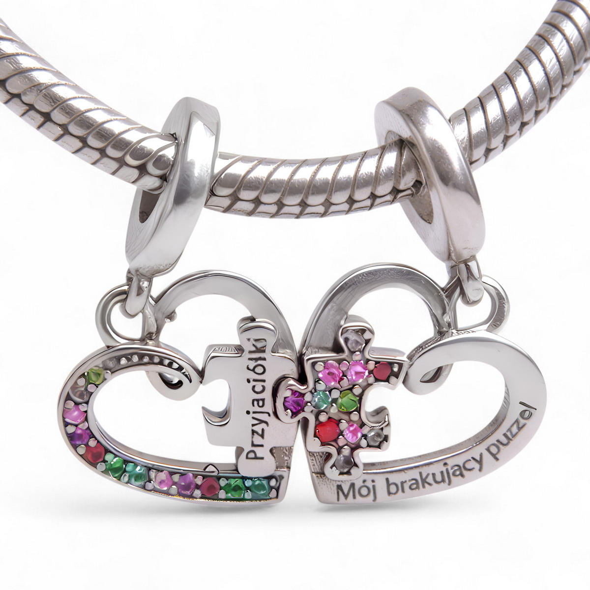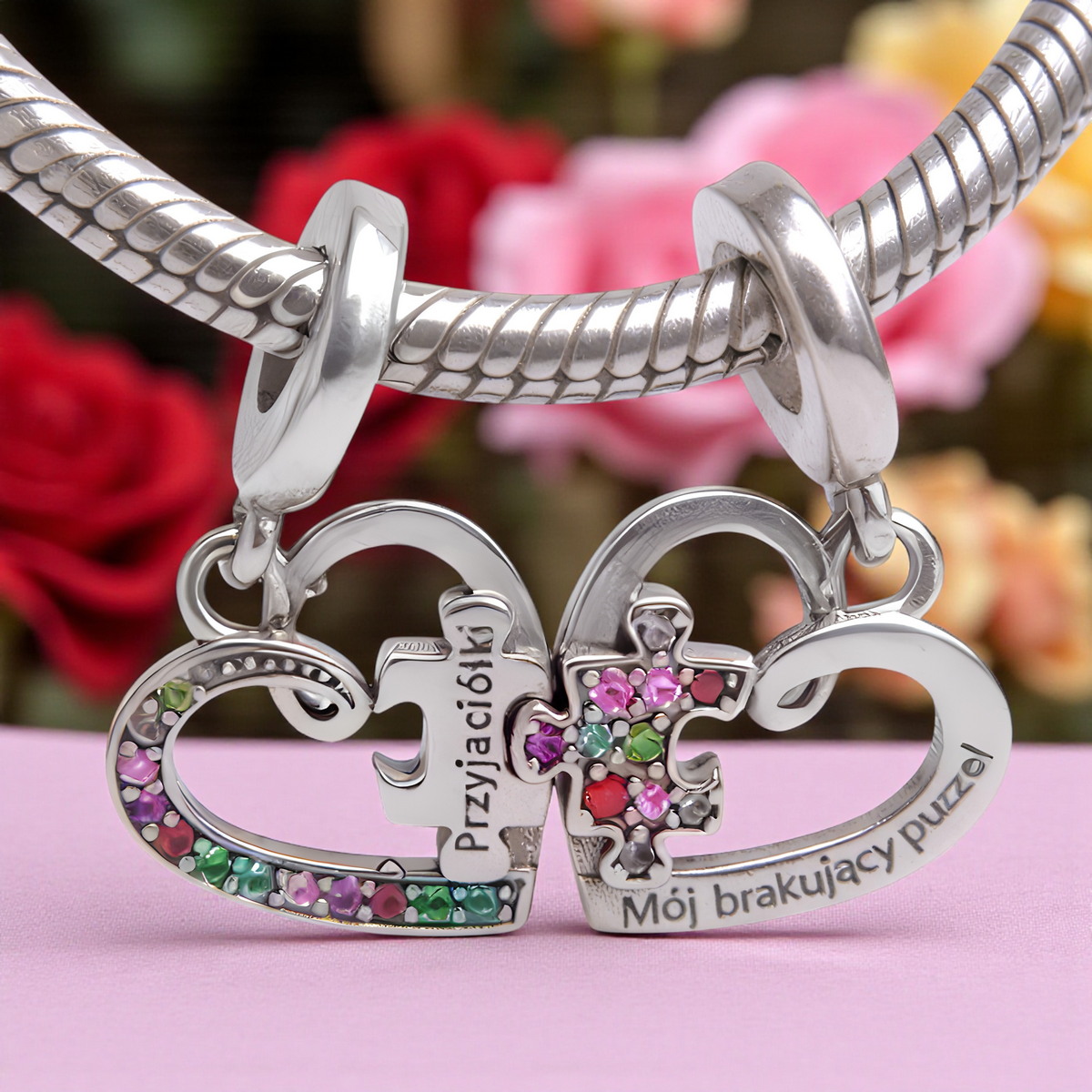 ✍️ Wyjątkowe Grawery – na jednej połówce serca widnieje grawer “Przyjaciółki”, a na drugiej “Mój brakujący puzzel”, co sprawia, że charms jest niezwykle osobistym i wzruszającym prezentem.