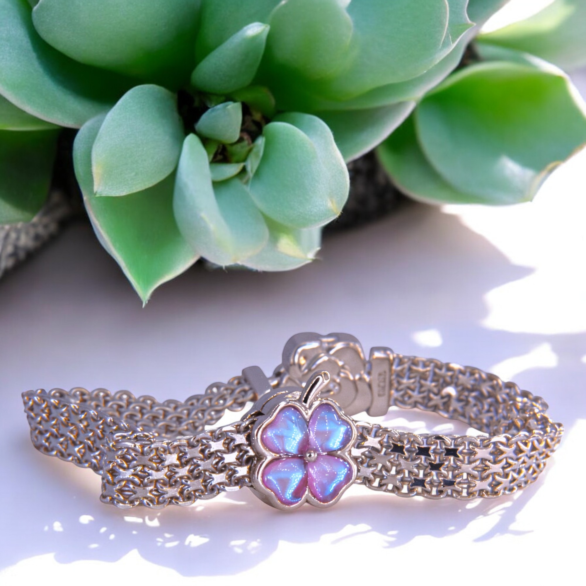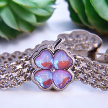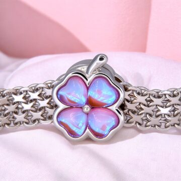 „Fioletowa Koniczyna” to charms, który przyciąga wzrok i hipnotyzuje kolorem. Opalizujący kryształ w odcieniach fioletu i różu zmienia się w zależności od kąta padania światła – tworząc efekt niczym z magicznego świata. To biżuteria, która łączy nowoczesność z symboliką szczęścia.