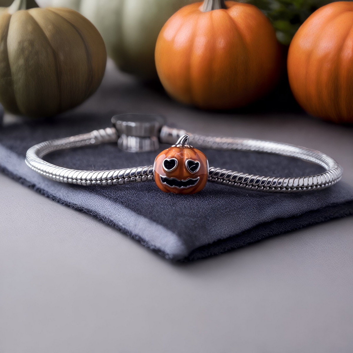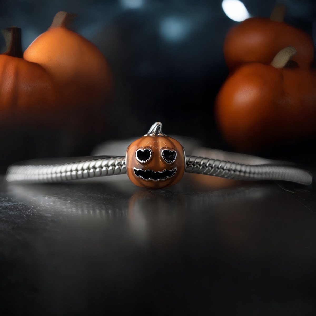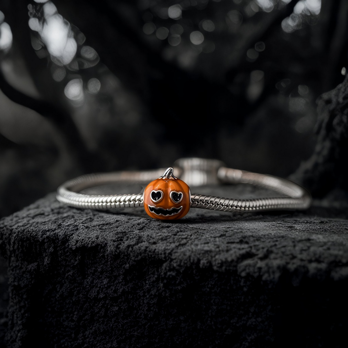 🧡 Figurka Dyni Halloween – Charms ma kształt uroczej, halloweenowej dyni. Na jej powierzchni wycięto uśmiechniętą buzię, a oczy mają kształt serduszek. Dzięki temu dynia wygląda przyjaźnie i zabawnie. Jest dostępna w klasycznej, pomarańczowej wersji, co idealnie pasuje do jesiennej aury.