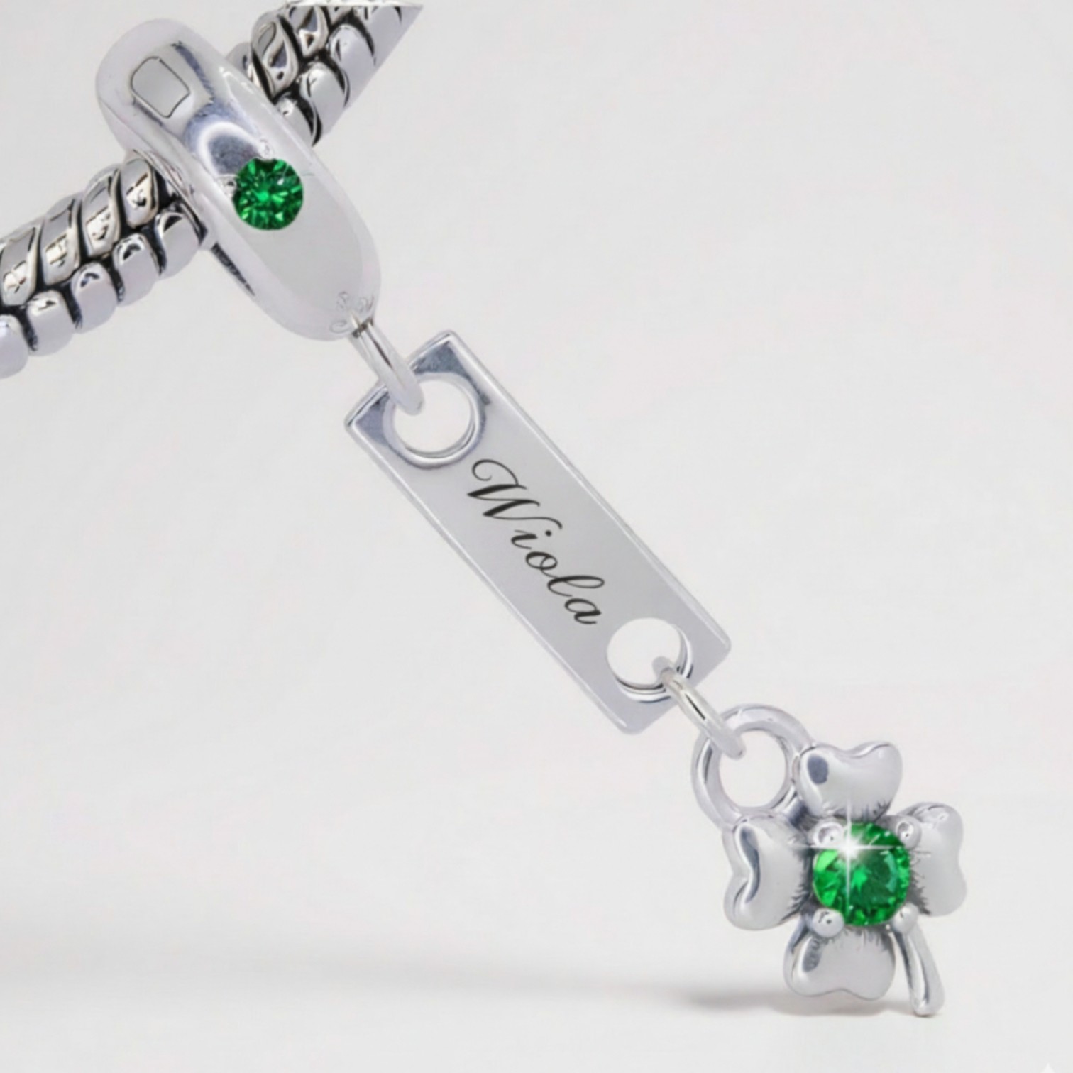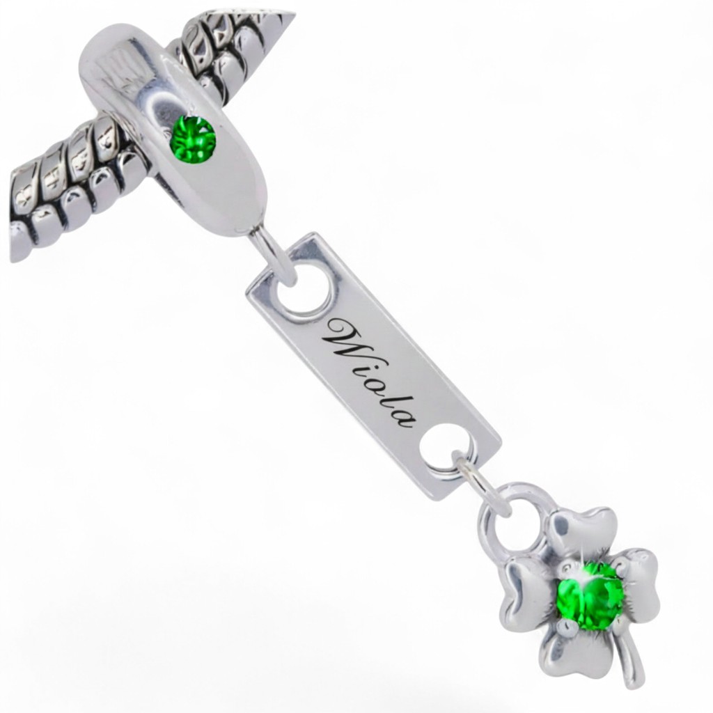 🍀 Koniczyna na Szczęście – Poniżej imiennika zawieszona jest miniaturowa koniczyna, będąca symbolem szczęścia. W jej centrum osadzono lśniącą, zieloną cyrkonię, która dodaje charmsowi koloru i blasku.