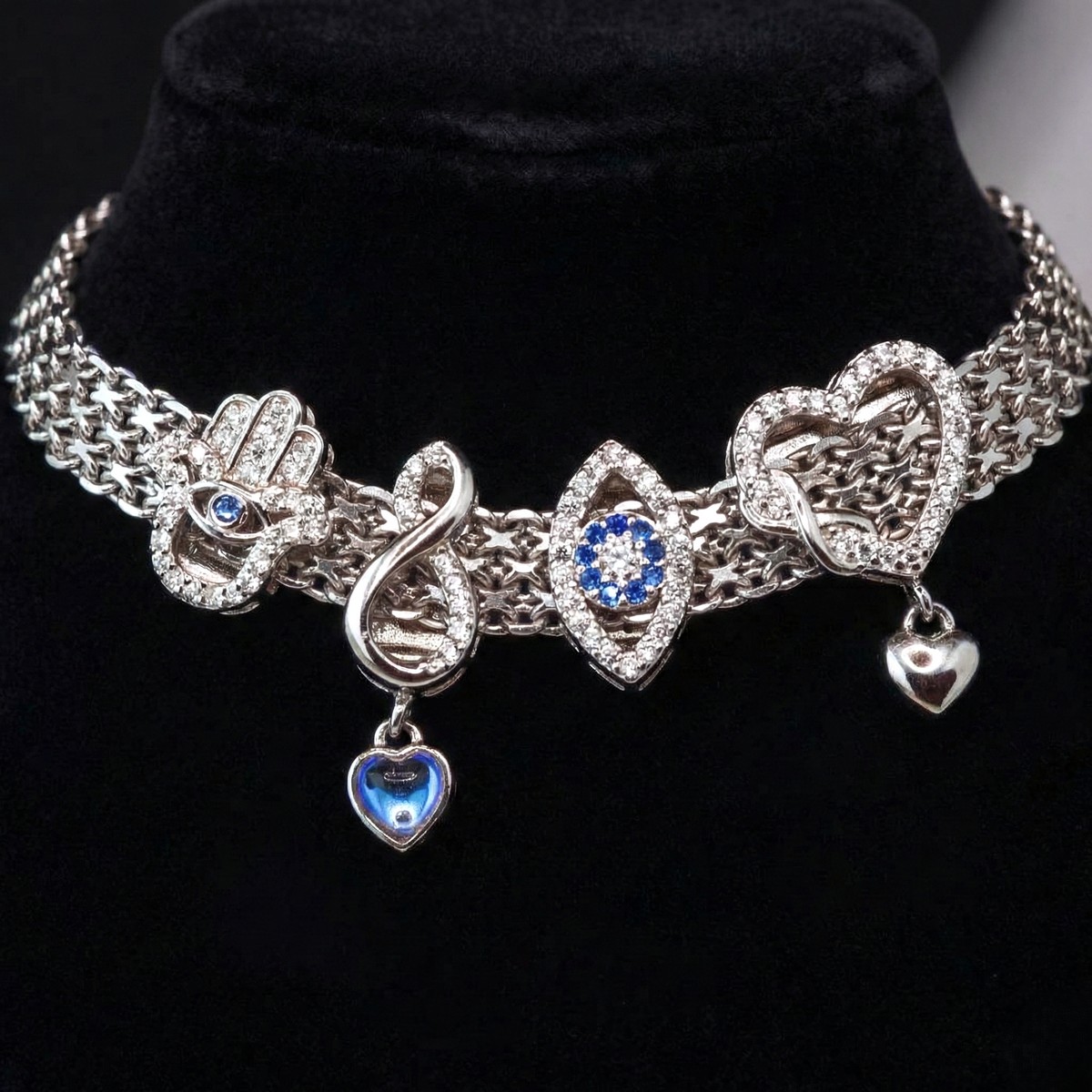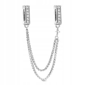 Charms został zaprojektowany specjalnie dla kolekcji Reflexions. Posiada płaski kształt i wbudowany mechanizm zatrzaskowy (klips), dzięki czemu stabilnie trzyma się na bransoletce typu “mesh” (siateczka) i nie przesuwa się samoczynnie. Całość pokryto warstwą platyny, co zapewnia trwałość i szlachetny połysk.