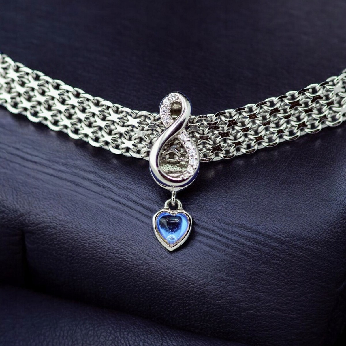 U dołu charmsa swobodnie kołysze się małe serduszko. W jego srebrną ramkę wprawiono kamień o niezwykłej barwie – przypomina on kamień księżycowy, mieniąc się mleczno-błękitnym blaskiem w zależności od kąta padania światła. To subtelny akcent kolorystyczny, który ożywia srebrną kompozycję.