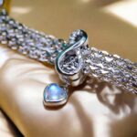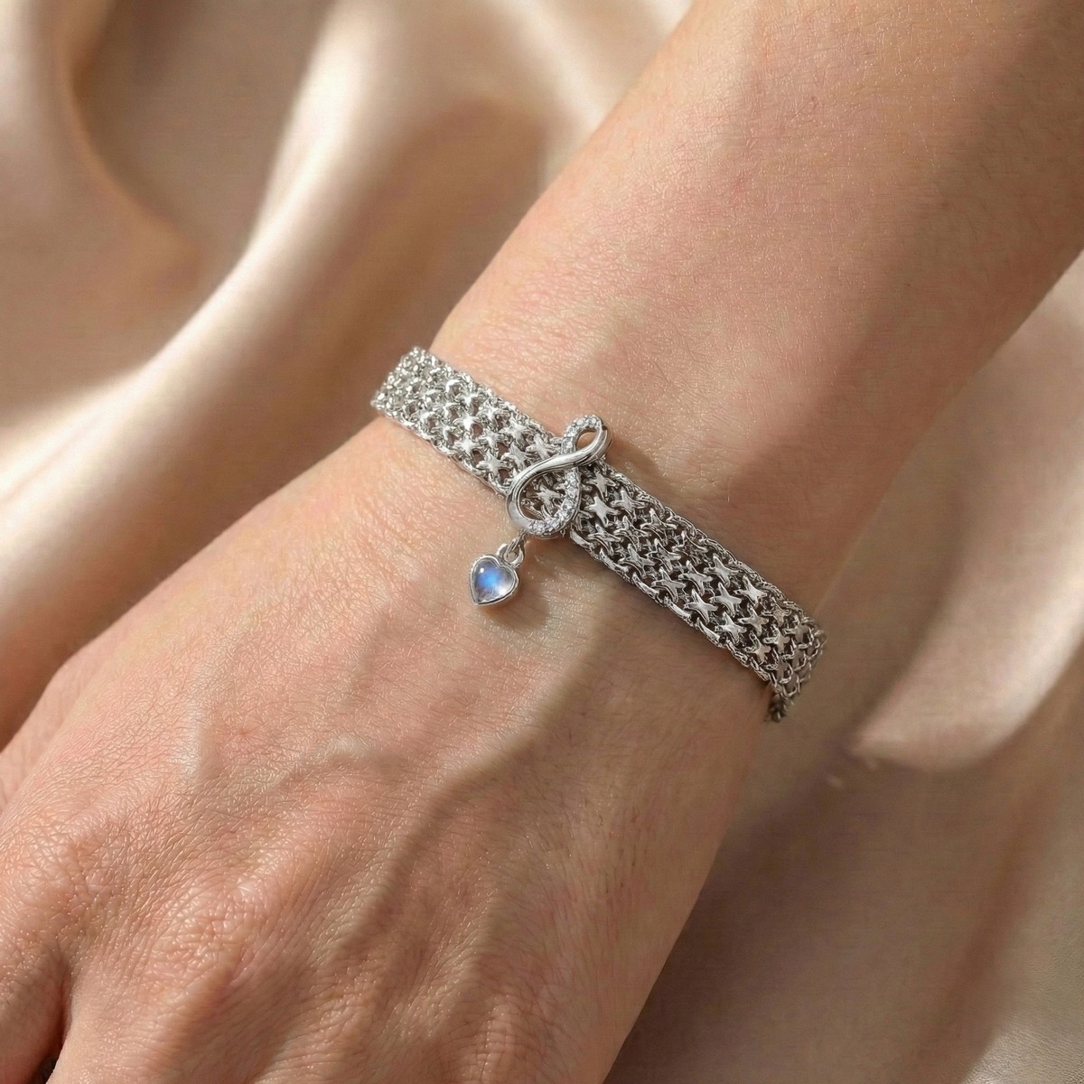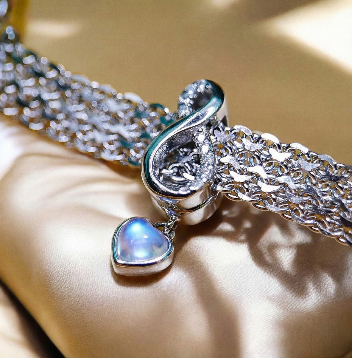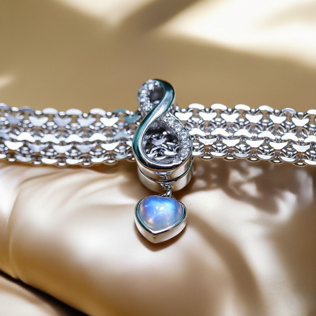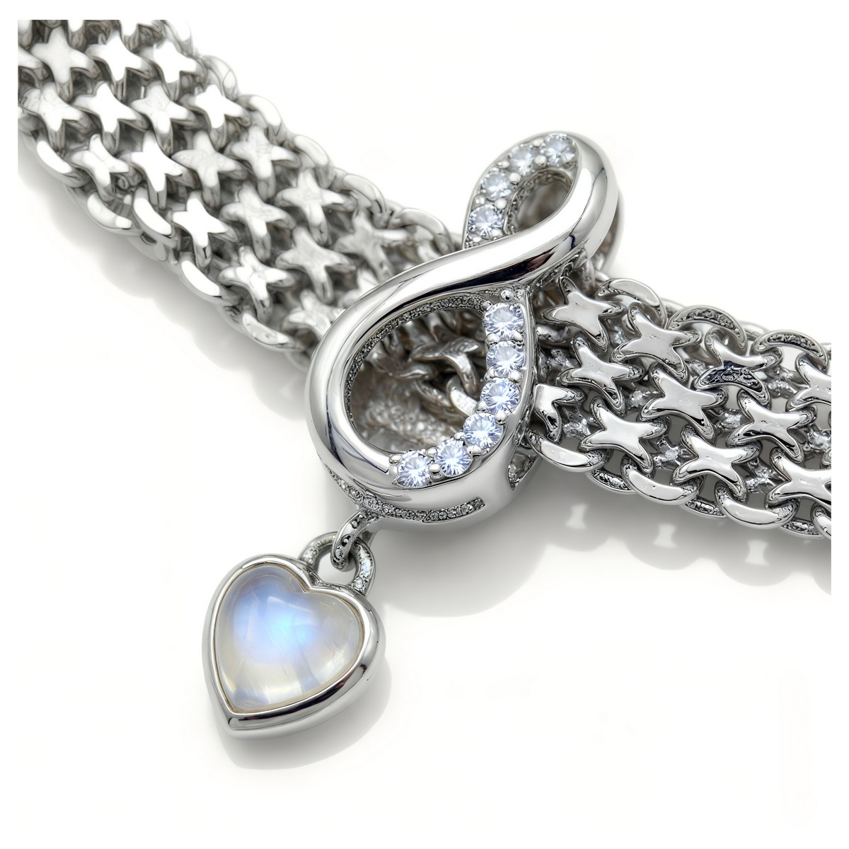 • Opalizujący Blask: Kamień w kształcie serca mieni się delikatną, księżycową poświatą, dodając stylizacji tajemniczego uroku.