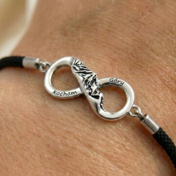 Centralnym elementem biżuterii jest srebrny łącznik (25×11 mm) w kształcie znaku nieskończoności z wplecionymi, oksydowanymi szczytami gór. Całość dopełnia wyraźny, sentymentalny grawer “Kocham góry”.
