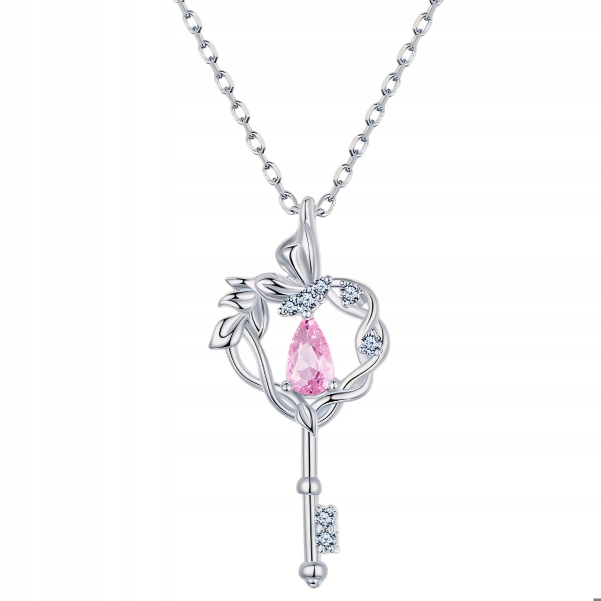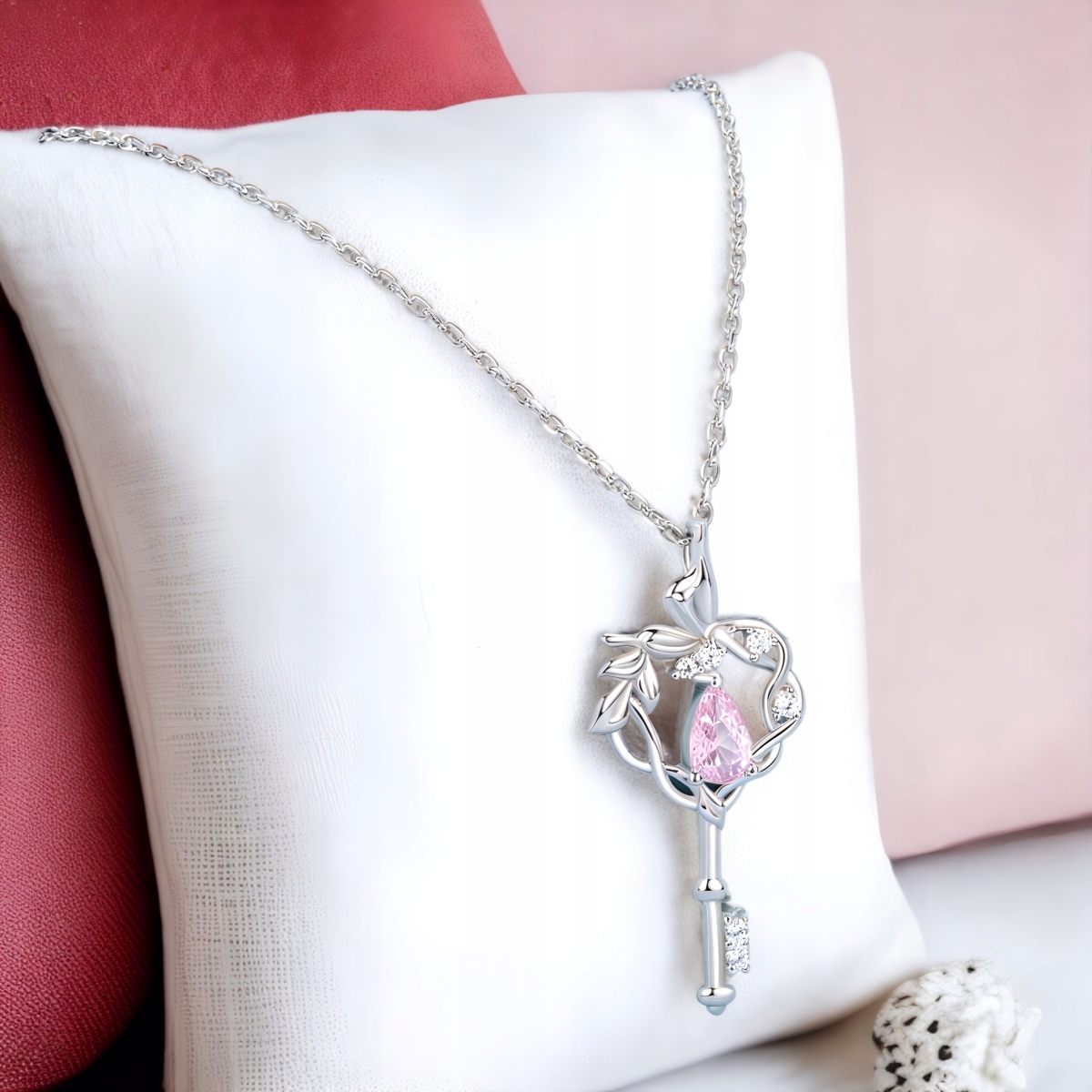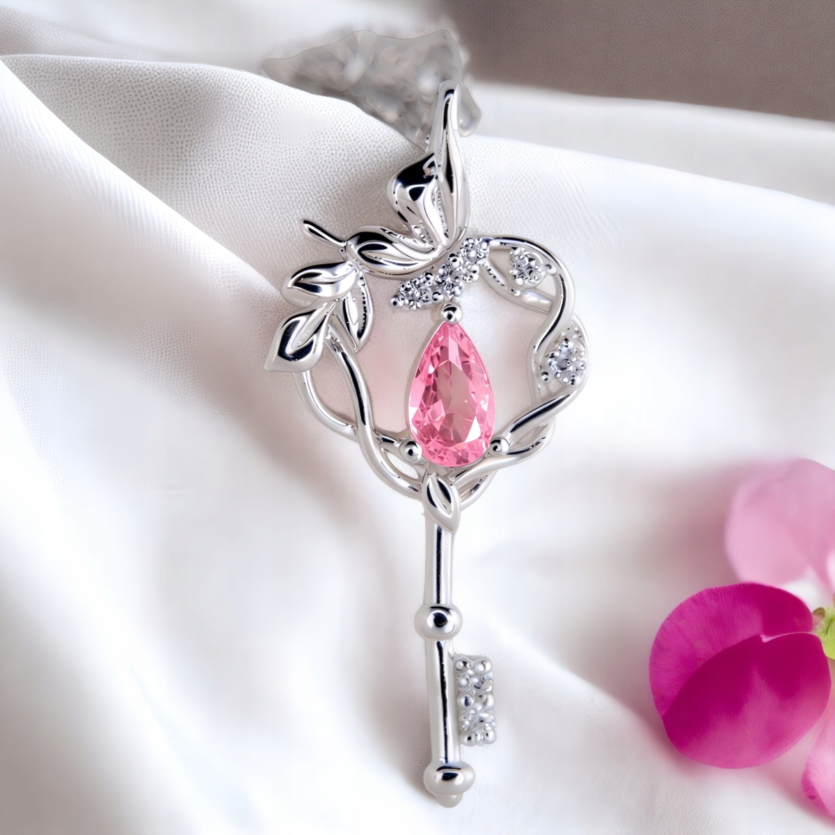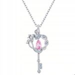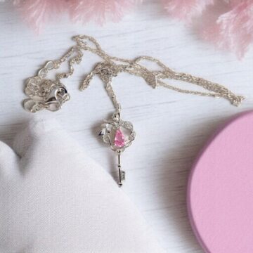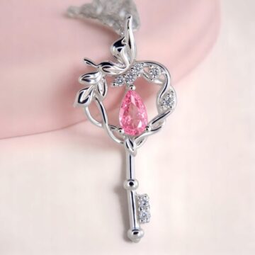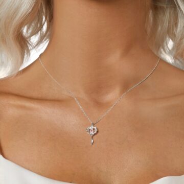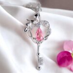 Motyw klucza to ponadczasowy symbol dostępu do tego, co najcenniejsze – serca, marzeń i wewnętrznej wolności. Zawieszka w delikatnym stylu botanicznym, z wijącymi się liśćmi i różowym kamieniem w kształcie łezki, przypomina o kobiecej sile, wrażliwości i pięknie.