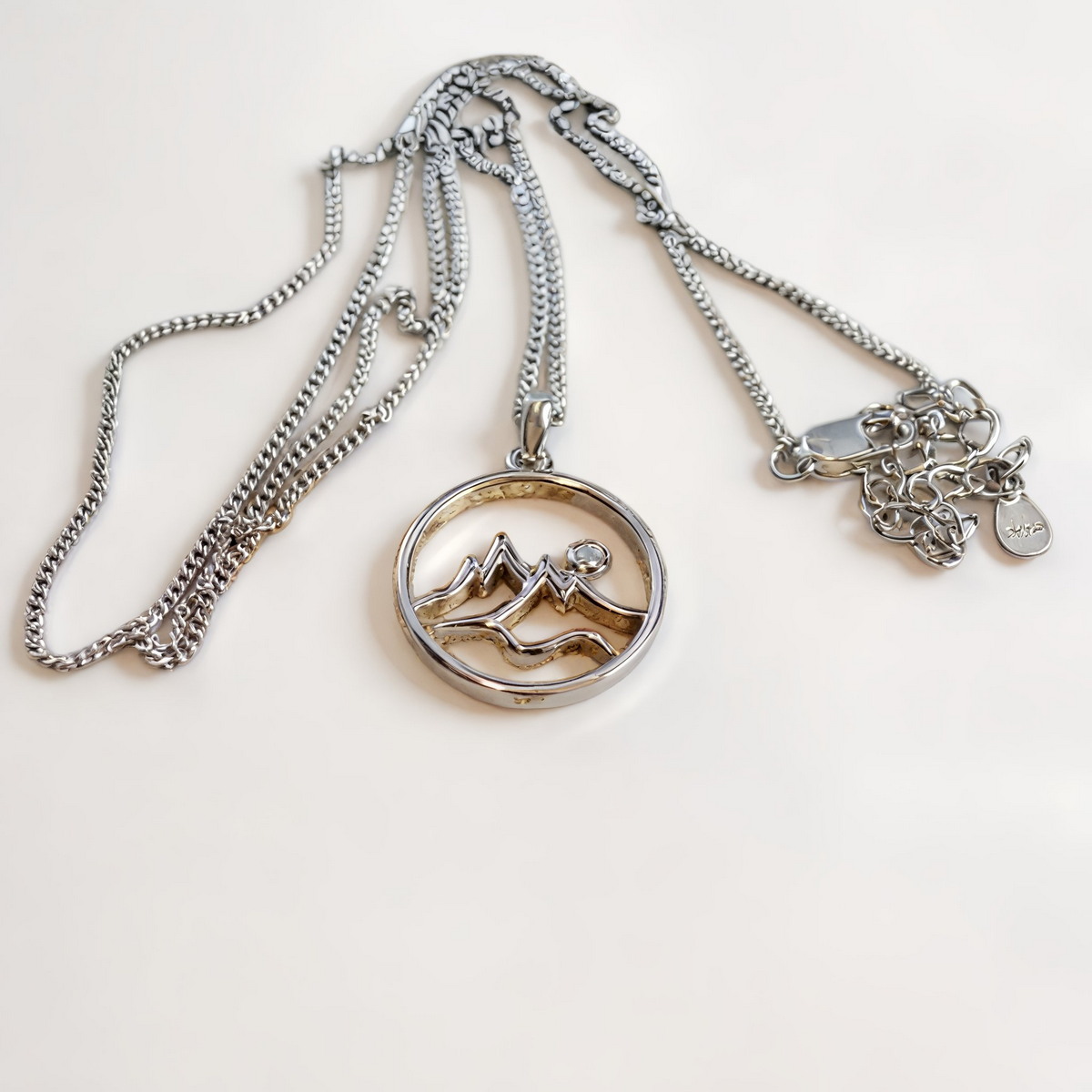 ☀️ Motyw Gór i Słońca – zawieszka przedstawia ażurowe wzniesienia z małym, lśniącym elementem w miejscu słońca, które pięknie odbija światło.