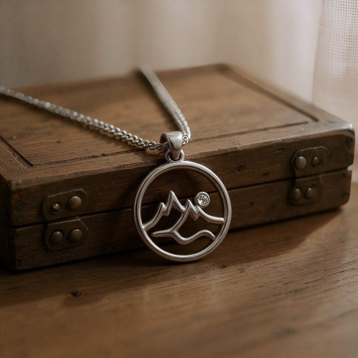 ✅ Design: Okrągła zawieszka z ażurowym motywem górskiego krajobrazu i słońca.