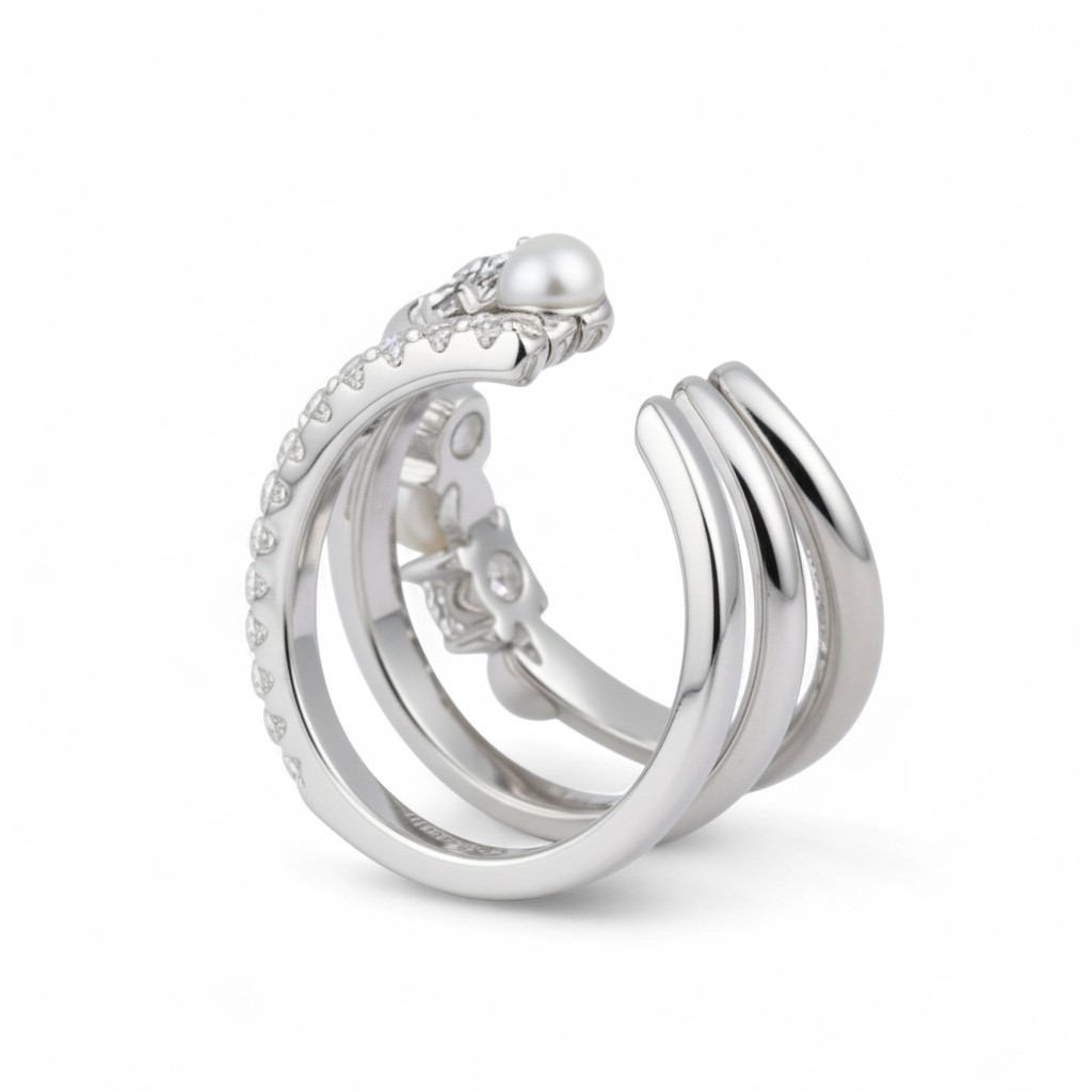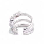 Ta spektakularna, wielowarstwowa nausznica to połączenie ponadczasowej elegancji i nowoczesnego blasku. Dwa z trzech pierścieni oplatających ucho zdobione są lśniącymi kamieniami i perłami, co tworzy wyjątkowo luksusowy i pełen wdzięku efekt. Idealna na specjalne okazje, dodaje wyrafinowania każdej stylizacji.