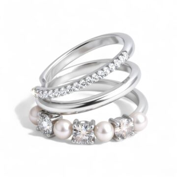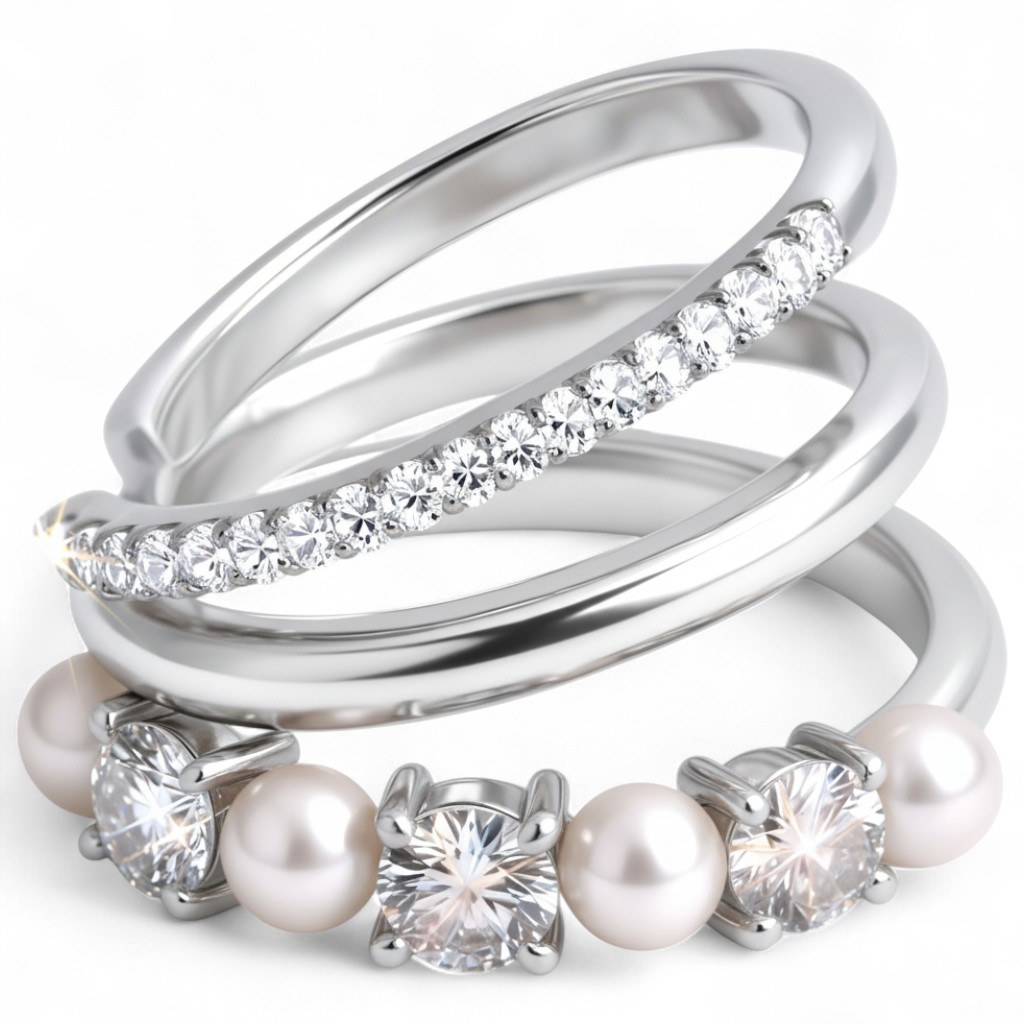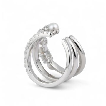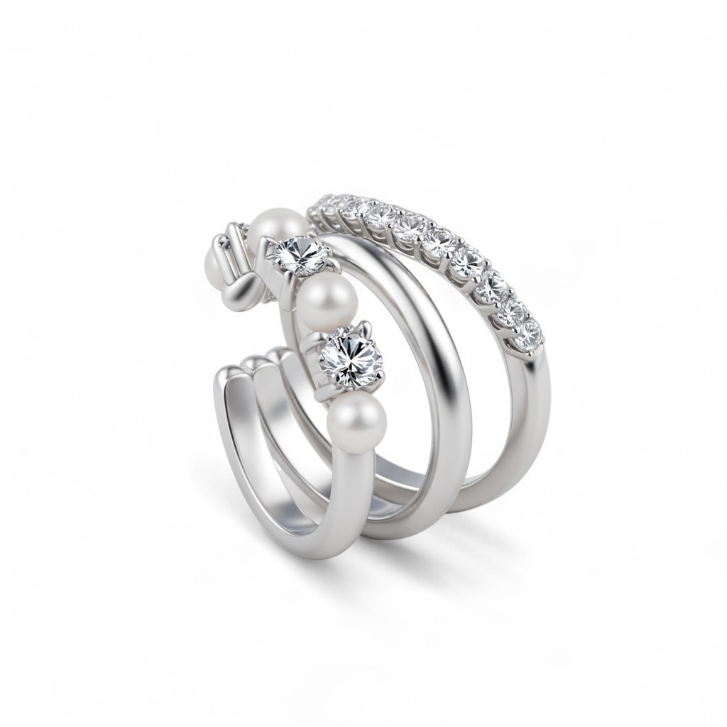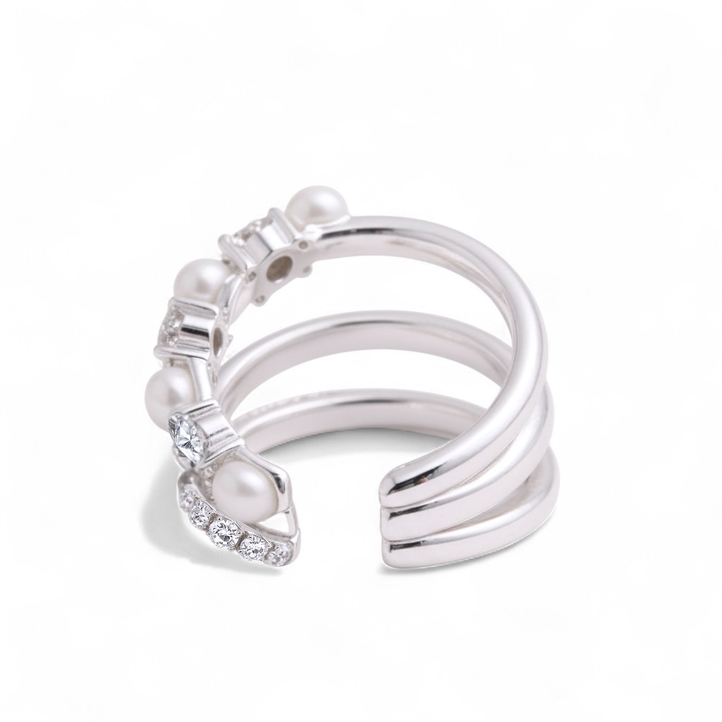 💍 Wykonanie: Nausznica składa się z trzech splecionych pierścieni. Jeden to gładkie, polerowane srebro. Drugi jest ozdobiony rzędem drobnych, lśniących kamieni. Trzeci pierścień łączy duże, szlifowane moissanity z delikatnymi perłami słodkowodnymi.