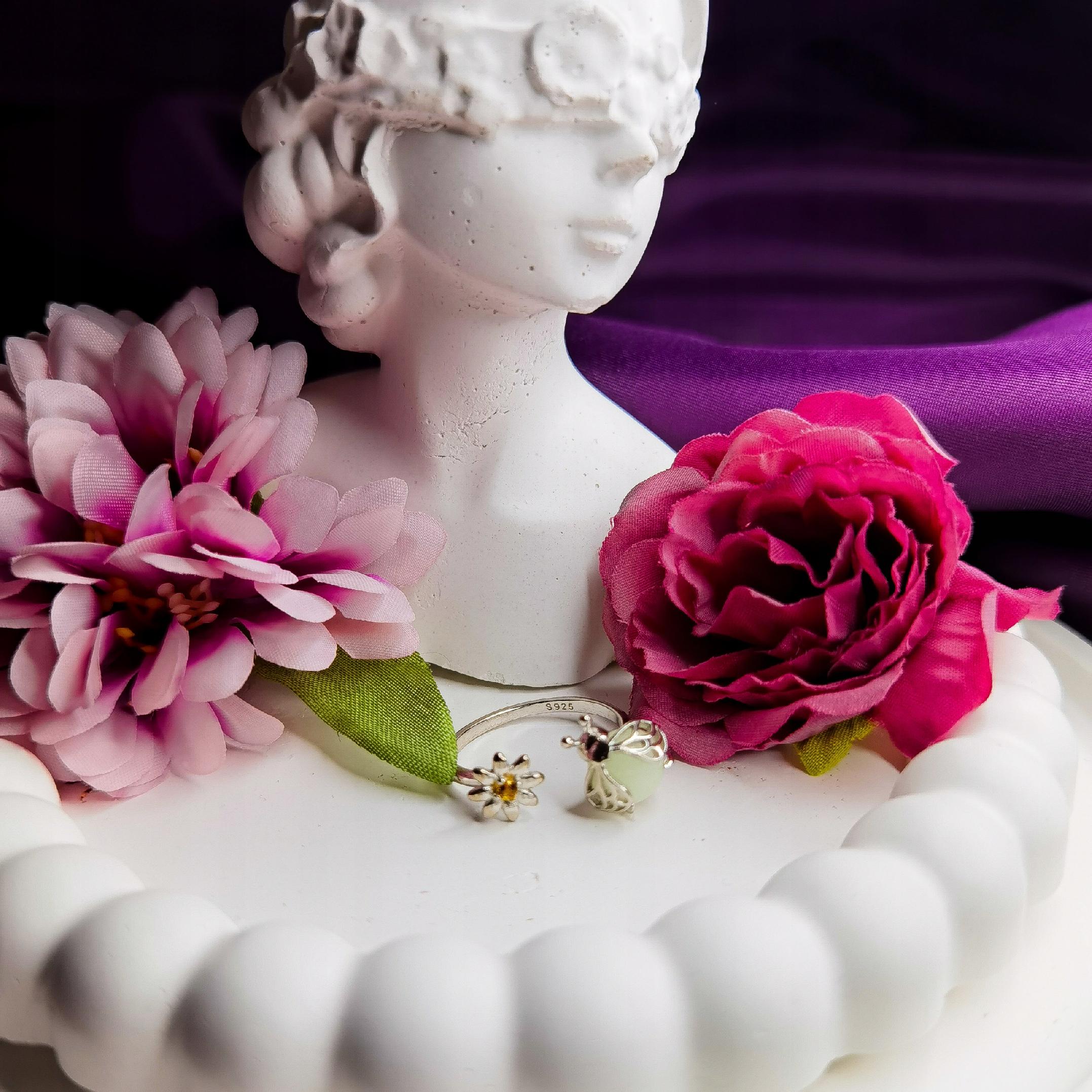 🌼 Detal Stokrotki – Pierścionek jest otwarty i regulowany, a na jego drugim końcu znajduje się delikatny kwiatek stokrotki z cyrkonią, który dodaje całości subtelności i uroku.