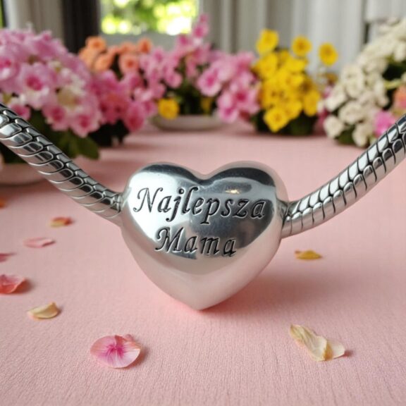 Ten srebrny charms w kształcie serca z eleganckim napisem jest doskonałym wyborem zarówno dla młodszych, jak i dorosłych córek, które chcą podarować mamie coś symbolicznego. To także świetny pomysł dla mam, które chcą sprawić prezent córkom – tworząc piękną tradycję wymiany charmsów na bransoletki.